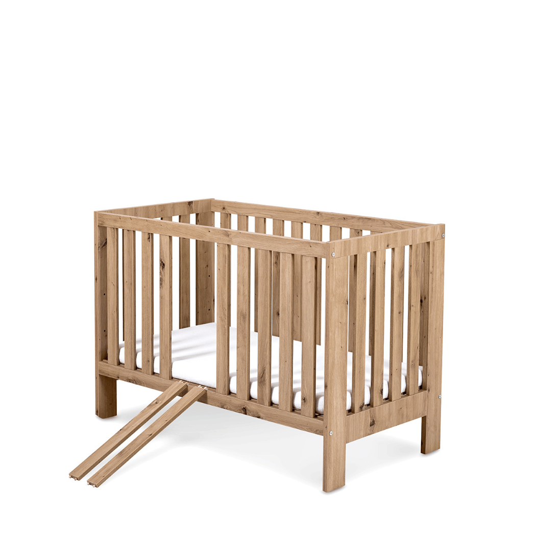 Polskie łóżeczko dziecięce AMELIA II 120x60 w kolorze dębu – z wyjmowanymi szczebelkami i opcją barierki
