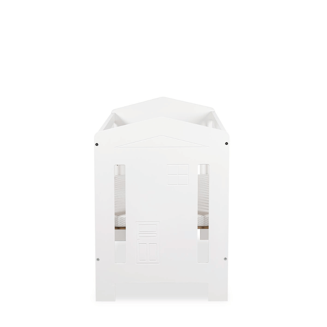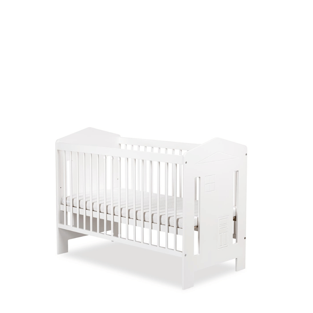 Mebel wykonany został z naturalnego drewna sosnowego oraz malowanej płyty MDF, przy użyciu bezpiecznych farb wolnych od formaldehydu. Biała kolorystyka i subtelne detale – takie jak uroczy wzór domku na szczytach – sprawiają, że łóżeczko wpisuje się w aktualne trendy aranżacyjne i doskonale dopełnia dziecięcy pokój w stylu skandynawskim lub klasycznym. Solidne szczebelki dbają o bezpieczeństwo malucha, zapewniając jednocześnie swobodną cyrkulację powietrza.