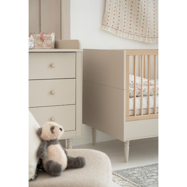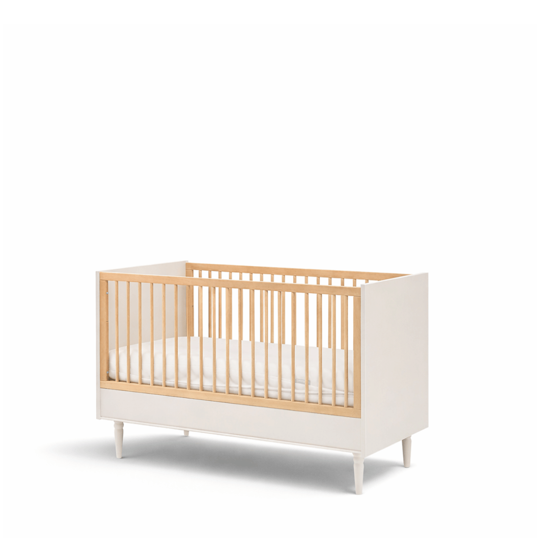 Złote uchwyty, lekkie bukowe nóżki i dopracowane proporcje sprawiają, że łóżeczko idealnie wpisuje się w styl nowoczesny, japandi, skandynawski i klasyczny.
