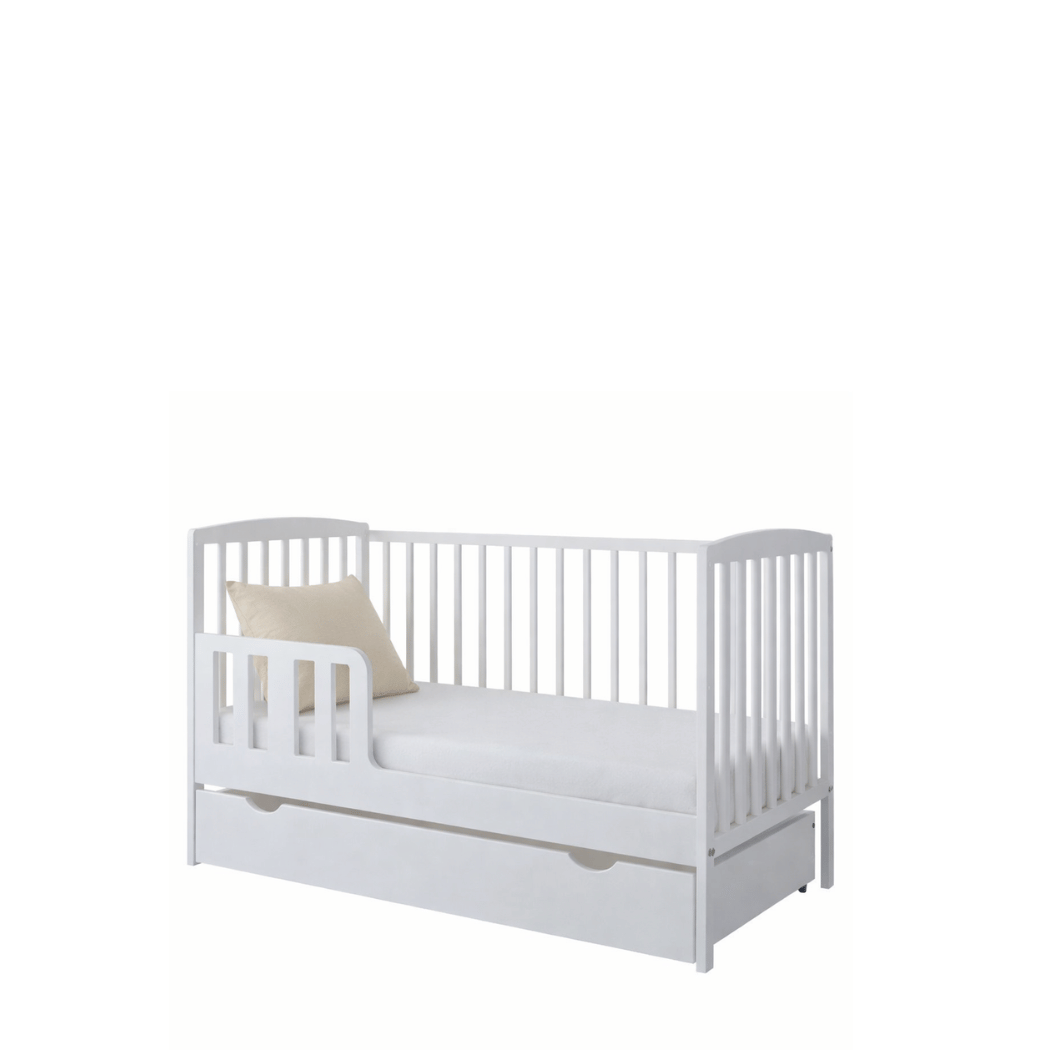 Dodatkowo, łóżeczko może zostać wyposażone w szufladę na kółkach, co ułatwia przechowywanie dodatkowych przedmiotów w pobliżu łóżeczka. Szczególnie praktyczne jest zabezpieczenie górnej części szuflady płytą, która chroni zawartość przed widokiem i kurzem.