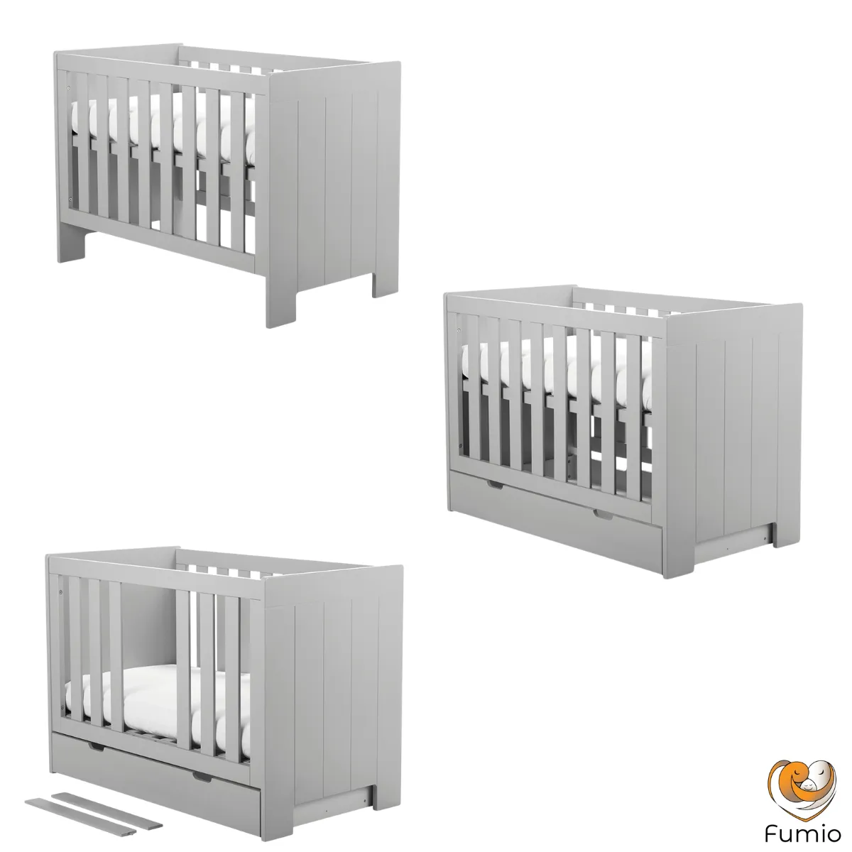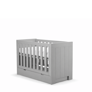 Łóżeczko świetnie komponuje się z innymi meblami z kolekcji Pinio Calmo szare, tworząc spójny zestaw do pokoju niemowlaka.