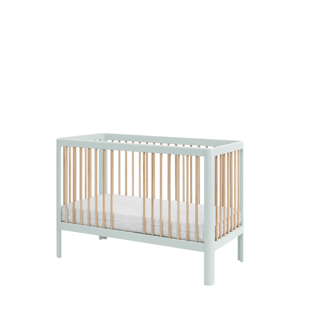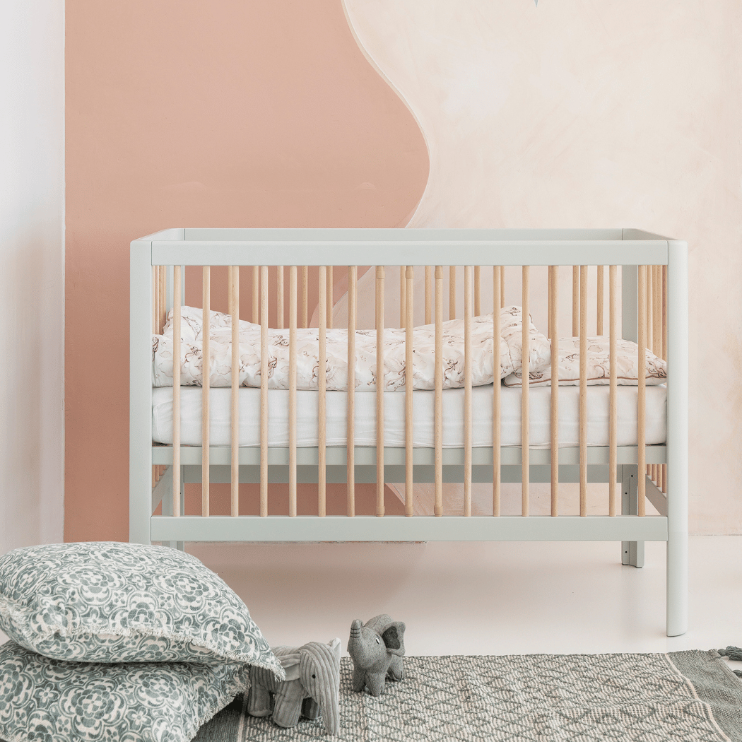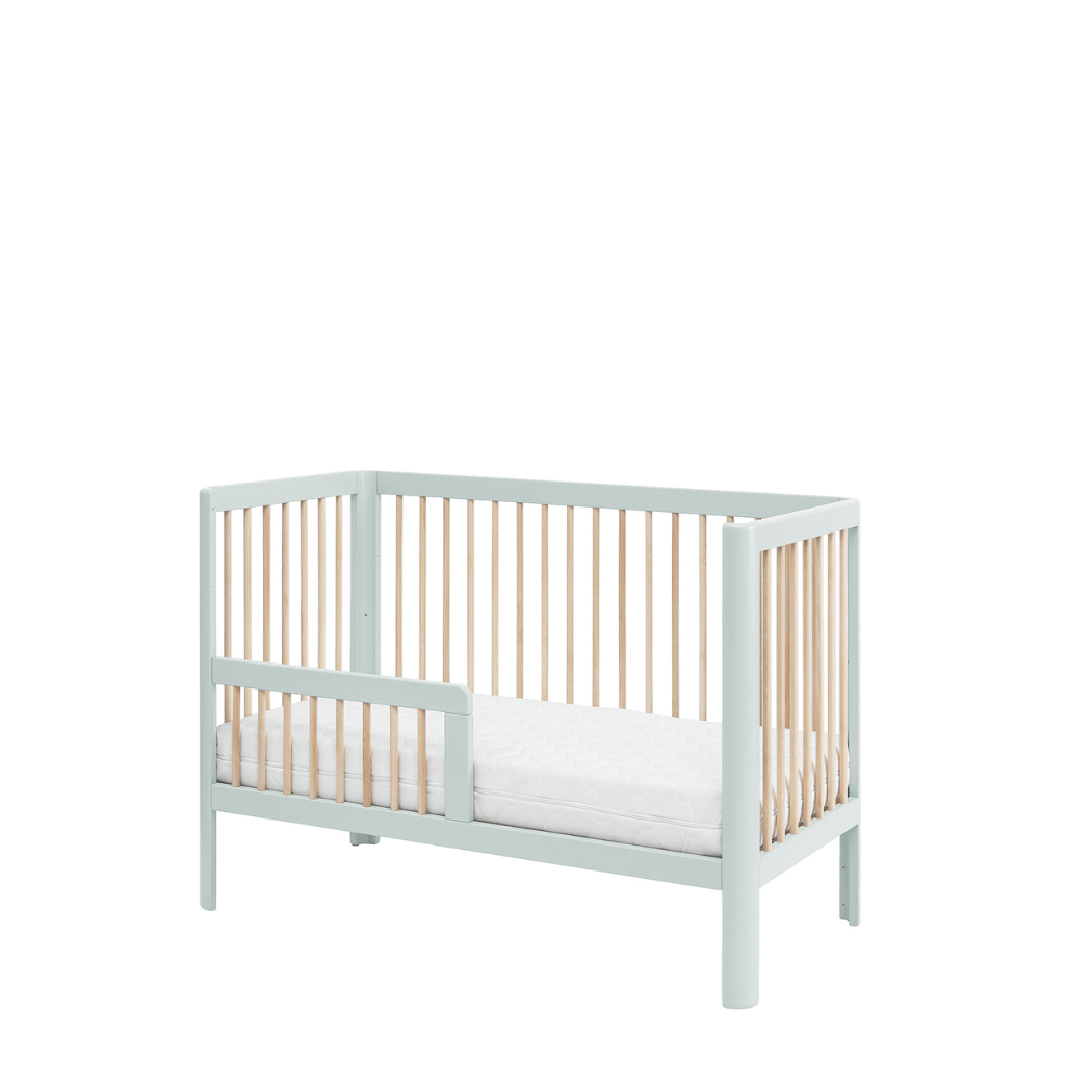 Pastelowa zieleń, zaokrąglone boki i lekka forma sprawiają, że łóżeczko pasuje do spokojnych, naturalnych i nowoczesnych aranżacji pokoju dziecka.