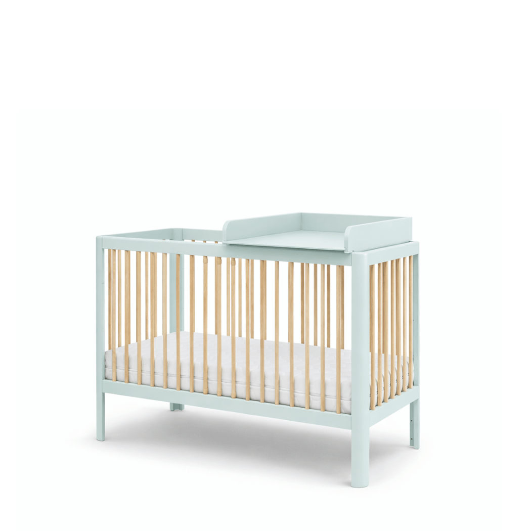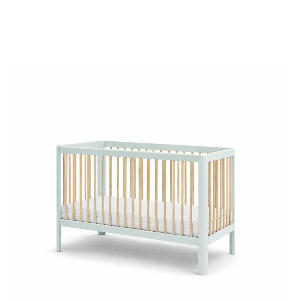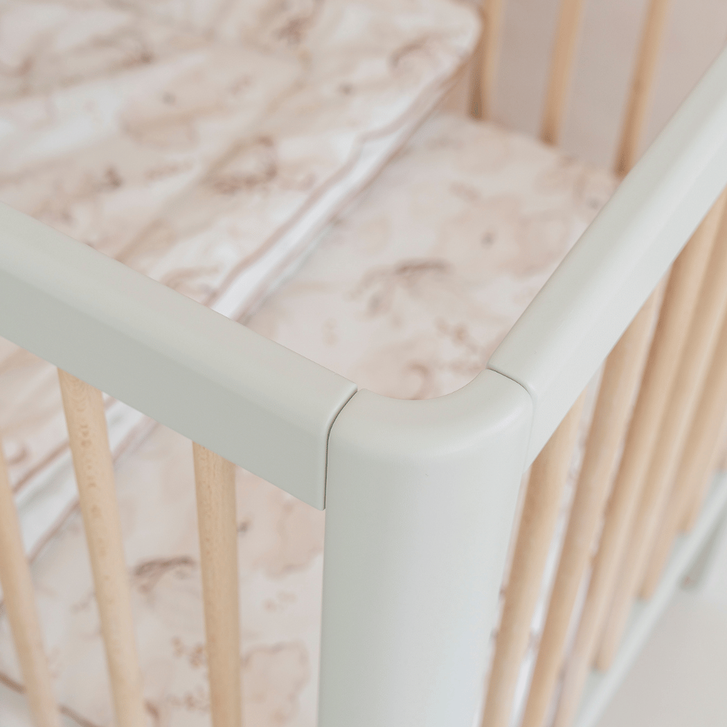 Pastelowa zieleń, zaokrąglone boki i lekka forma sprawiają, że łóżeczko pasuje do spokojnych, naturalnych i nowoczesnych aranżacji pokoju dziecka.