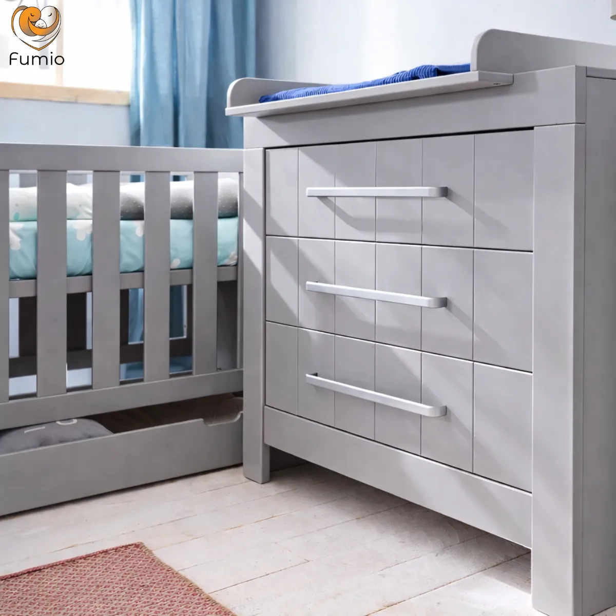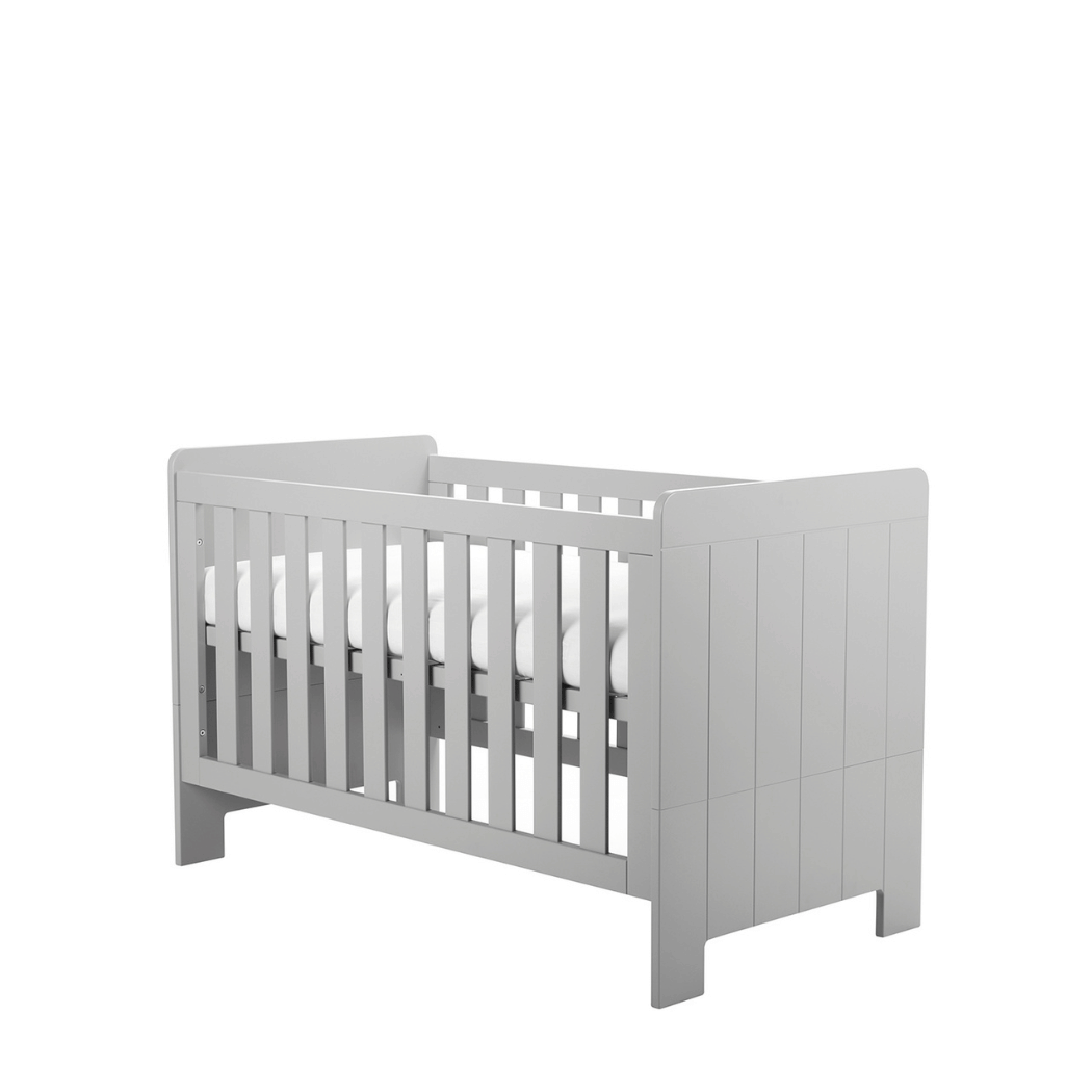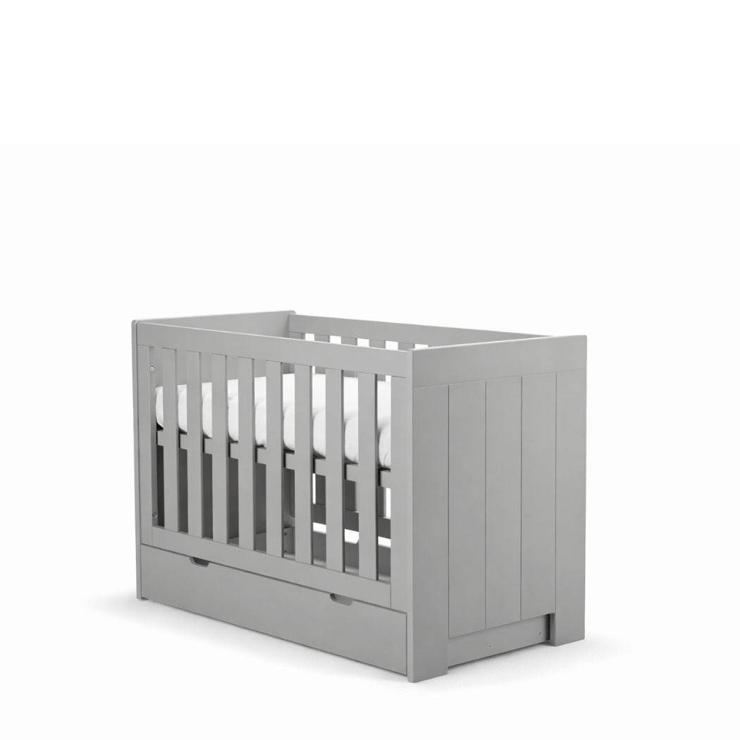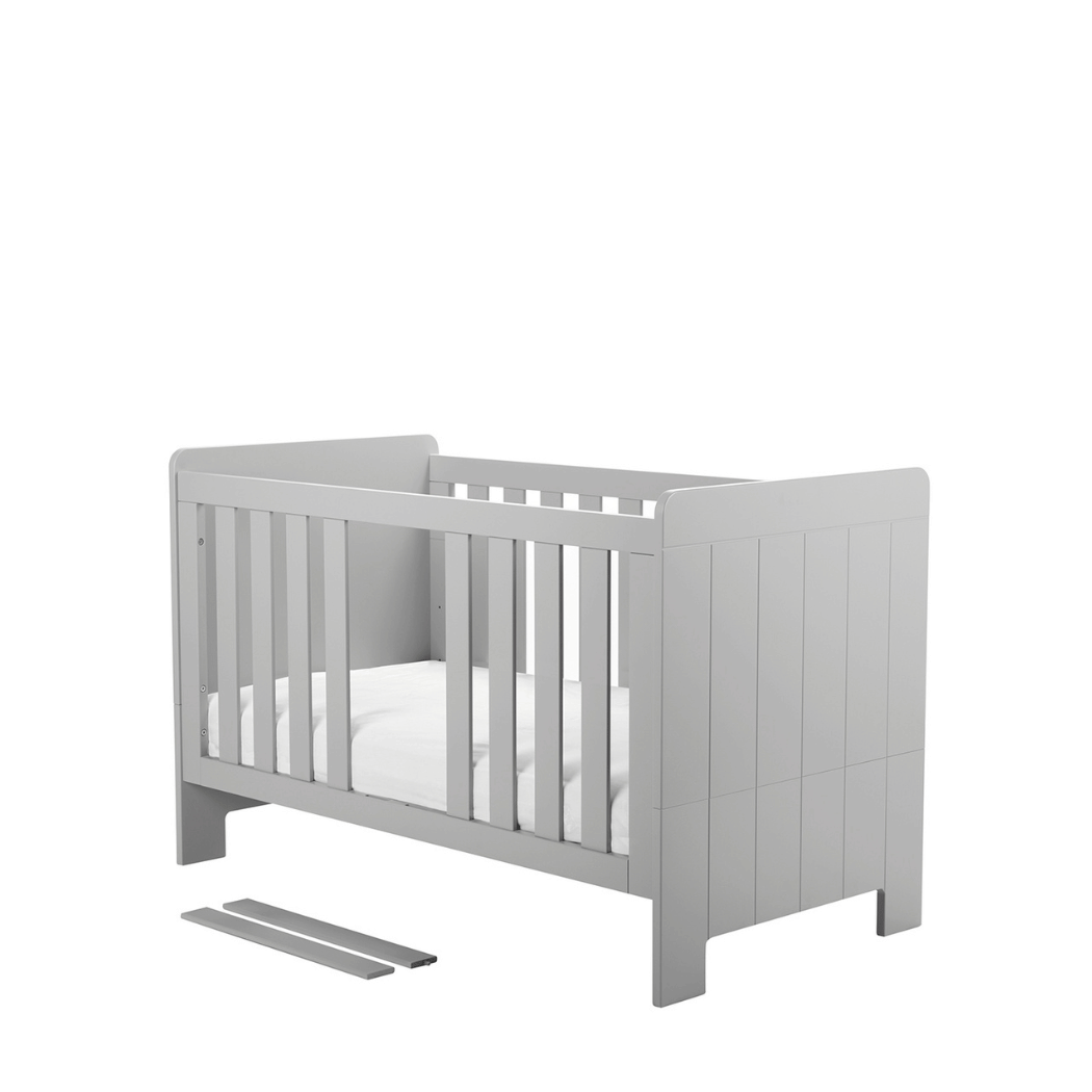 Łóżeczko świetnie komponuje się z innymi meblami z kolekcji Pinio Calmo szare, tworząc spójny zestaw do pokoju niemowlaka i starszego dziecka.