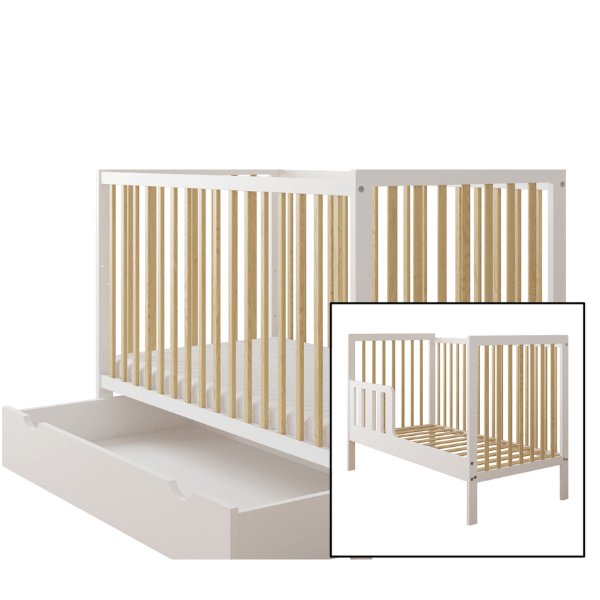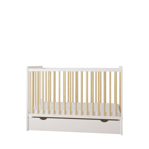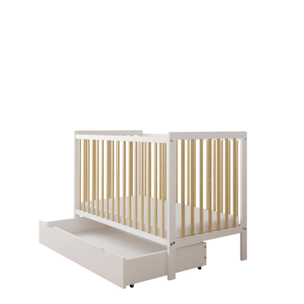 Trzy wyciągane szczebelki ułatwiają starszemu dziecku samodzielne wchodzenie i wychodzenie z łóżeczka. Duża, wysuwana szuflada na kółkach to idealne miejsce na pościel, pieluszki i akcesoria — zabezpieczona płytą chroni zawartość przed kurzem. Stelaż z wolnymi przestrzeniami między listwami zapewnia stałą wentylację materaca, co wpływa na jego higienę i trwałość.