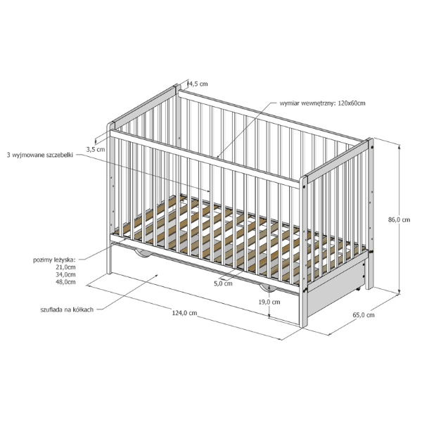 Łóżeczko posiada trzy poziomy regulacji wysokości leżyska, dzięki czemu można łatwo dostosować je do wieku i etapu rozwoju dziecka. Solidna konstrukcja stelaża, wykonana ze sklejki liściastej, zapewnia odpowiednie podparcie i stabilność. Przemyślana budowa podstawy sprzyja prawidłowej pozycji ciała maluszka, a otwory wentylacyjne umożliwiają stały przepływ powietrza, dbając o higienę materaca i zdrowy mikroklimat snu.
