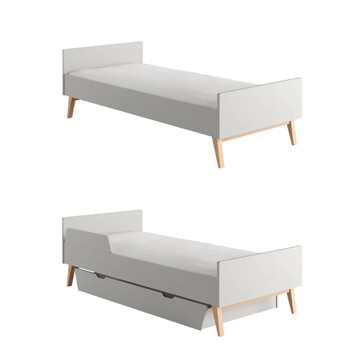 Szara bryła, prosta forma i bukowe nóżki sprawiają, że łóżko wygląda nowocześnie i dobrze odnajduje się w różnych aranżacjach – od pokoju dziecka po bardziej stonowaną przestrzeń nastolatka.