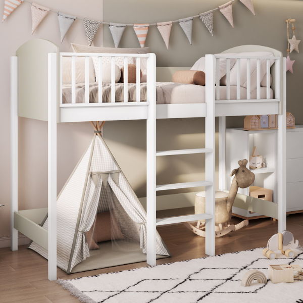 Stabilna rama wykonana została z drewna pomalowanego wybranym przez Was kolorze, co nie tylko nadaje jej eleganckiego wyglądu. Całość uzupełniają elementy z płyty laminowanej w wybrany (w opcjach) odcieniu np. kaszmirowego beżu, dzięki czemu model ten z łatwością dopasujesz do istniejącej zabudowy meblowej w pokoju dziecka — niezależnie od tego, czy dominuje tam styl nowoczesny, skandynawski czy bardziej klasyczny.