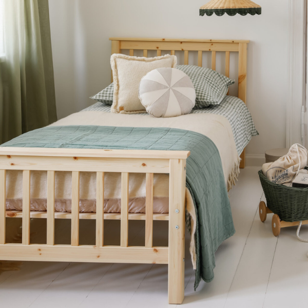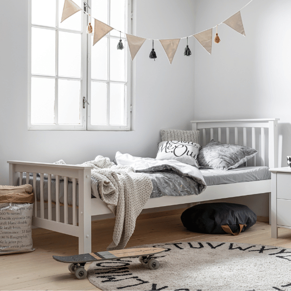 Delikatna forma łóżka, ozdobione szczebelkami wezgłowie i zanóżek, nawiązuje do skandynawskiego minimalizmu – lekkiego, naturalnego i estetycznego. To doskonały wybór zarówno do pokoju chłopca, jak i do bardziej neutralnych, nowoczesnych aranżacji dziecięcych.