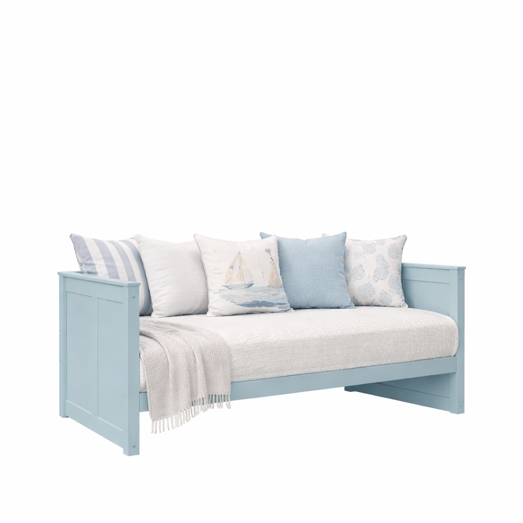 Daybed Collet w kolorze pastelowego niebieskiego to idealny mebel do pokoju dziecka lub nastolatka, w którym liczy się zarówno estetyka, jak i funkcjonalność. Jasnoniebieski odcień działa kojąco, tworząc atmosferę spokoju, bezpieczeństwa i przytulności – doskonałą do codziennego wypoczynku.