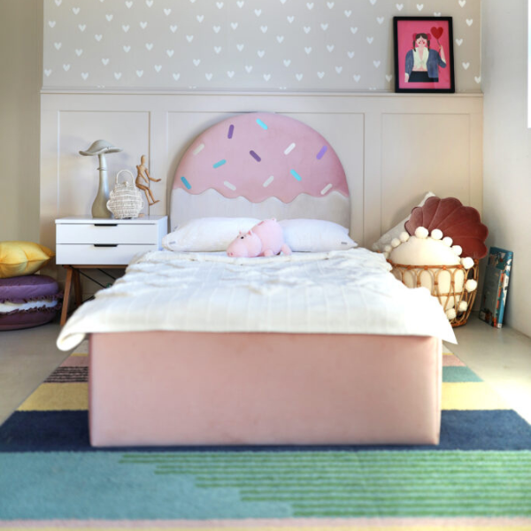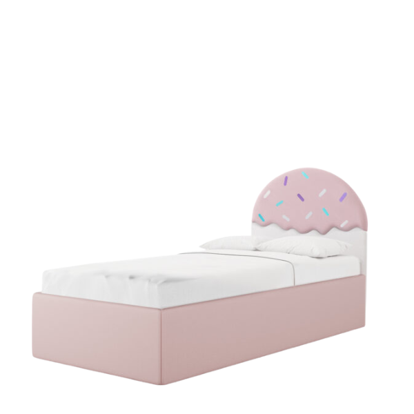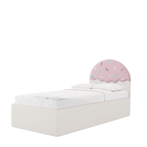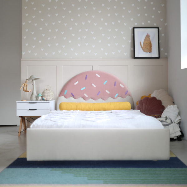 Zanurz się w fascynującym świecie słodyczy z niezwykłym łóżkiem dziecięcym z zagłówkiem w kształcie lodowego deseru z posypką – nową perełką z rodzinnej manufaktury Minko! Ten wyjątkowy mebel został zaprojektowany z myślą o dzieciach i nastolatkach, które kochają kolor, przytulność i oryginalne detale. Tapicerowany zagłówek inspirowany apetycznym pucharkiem lodów z kolorową posypką zachwyca nie tylko wyglądem, ale i funkcjonalnością – zapewnia miękkie i wygodne oparcie podczas czytania, relaksu czy wieczornego odpoczynku. Dodatkowym atutem łóżka jest przestronna skrzynia na pościel, ukryta w jego konstrukcji. Tapicerowana tą samą tkaniną, co dolna część „loda”, dostępna jest w delikatnym różu lub kremowym odcieniu – możesz więc wybrać wersję, która najlepiej pasuje do stylu pokoju Twojego dziecka. Pojemnik otwierany do góry pomieści nie tylko pościel, ale też zabawki, ubrania sezonowe i inne skarby małego domownika. Stabilna, drewniana konstrukcja i materiały z certyfikatem OEKO TEX gwarantują bezpieczeństwo, trwałość i ekologiczne wykończenie. Dla jeszcze większego komfortu możesz dobrać boczki zabezpieczające oraz miękkie panele ścienne PILLE. Łóżko dostępne jest w wielu rozmiarach, dzięki czemu rośnie razem z dzieckiem i zachwyca przez długie lata. Minko to design, który pokochasz od pierwszego wejrzenia – słodki, stylowy i stworzony z sercem!