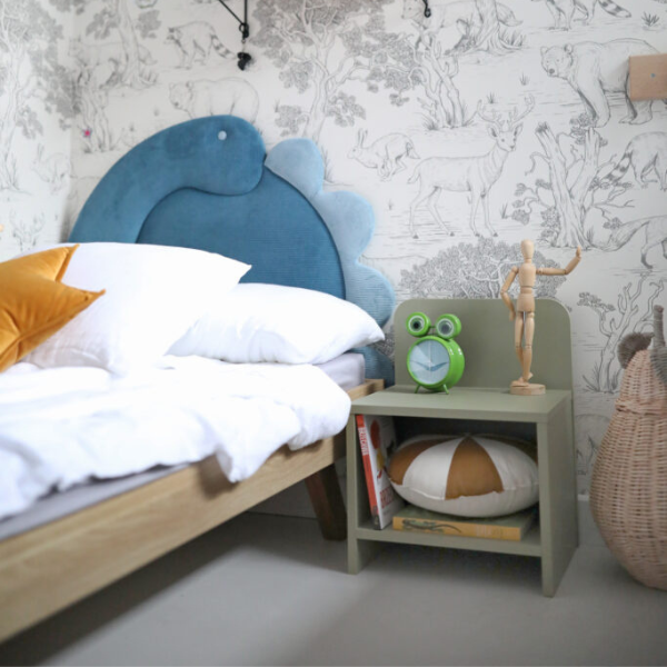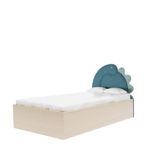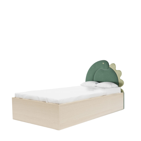 Ożyw dziecięcy pokój magią czasów prehistorycznych z łóżkiem Dino – wyjątkowym meblem z tapicerowanym zagłówkiem w kształcie dinozaura i praktyczną skrzynią w kolorze naturalnego drewna.