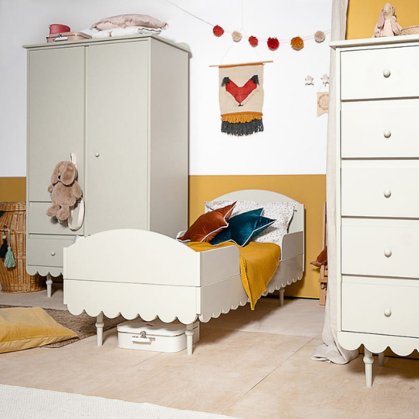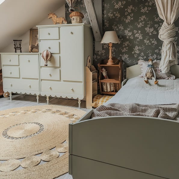Stylowy mebel w kolorze oliwkowym to doskonały akcent do pokoju dziecka, wprowadzający elegancję i rustykalny urok. Subtelne falbanki nadają mu lekkości i romantycznego charakteru, tworząc przytulną atmosferę. Drewniane nogi z finezyjnymi tłoczeniami podkreślają vintage styl i dodają wyrafinowania. To dekoracyjny i funkcjonalny element, który pięknie komponuje się z różnymi wnętrzami, dodając im oryginalności i ciepła. Idealny wybór dla miłośników klasycznych, sielskich aranżacji.