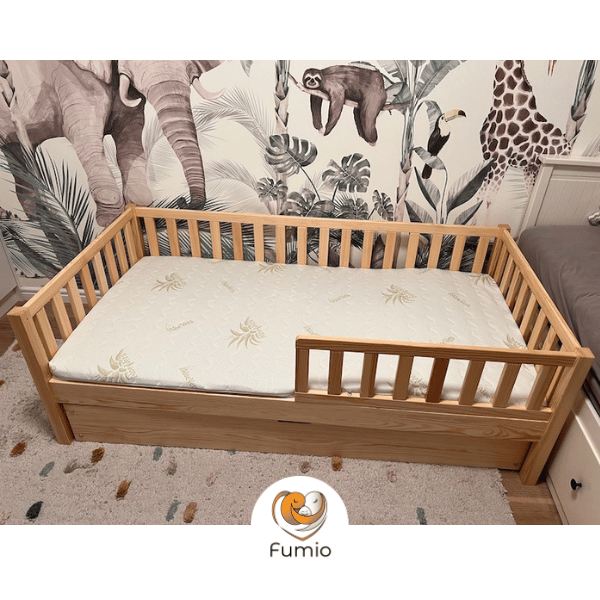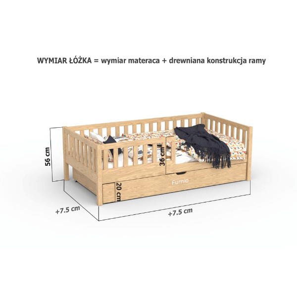 W przypadku tego łóżka dostępna jest również specjalna barierka, która została stworzona specjalnie z myślą o małych dzieciach. Ta barierka może być zamontowana po lewej lub po prawej stronie, aby dostosować się do preferencji i układu pokoju, sami decydujecie podczas montażu. Co więcej, istnieje opcja, w której barierka zabezpiecza 3/4 długości łóżka (do rozmiaru 90x180 cm będzie tylko 1/2), zapewniając jeszcze większe bezpieczeństwo dla dziecka.