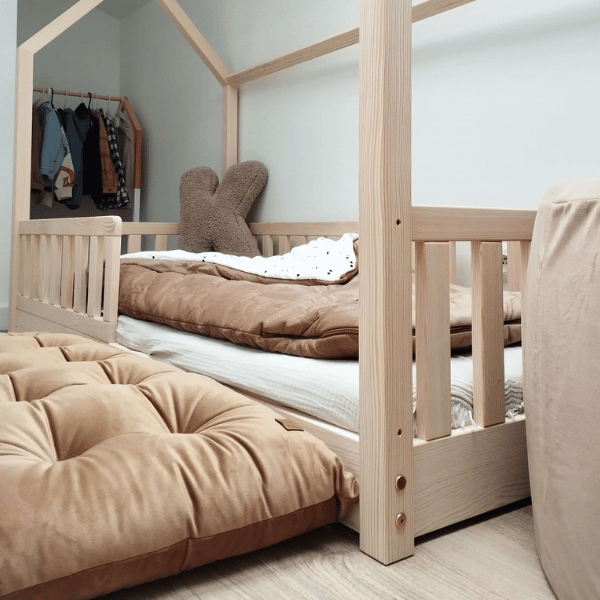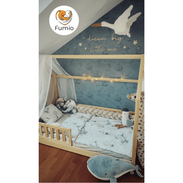 Dzięki niskiej konstrukcji, maluch może bez trudu wchodzić i wychodzić z łóżka, czując się pewnie i bezpiecznie. Kształt przypominający domek pobudza wyobraźnię i nadaje wnętrzu przytulności, a naturalny odcień niebieskiego wprowadza do pokoju spokój i harmonię.