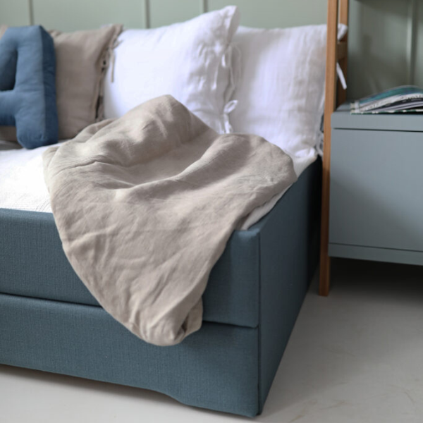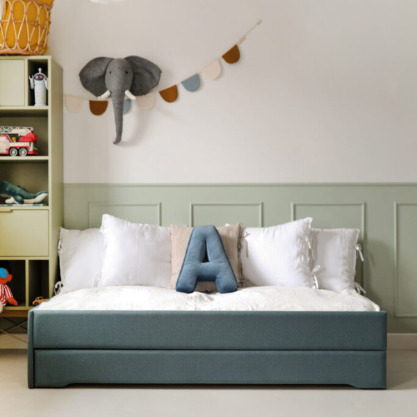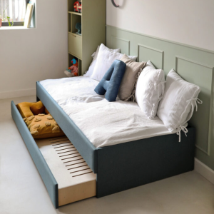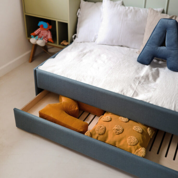 DOUBLE BED – rozkładane, tapicerowane łóżko dziecięce z funkcją spania i pojemnikiem na pościel!