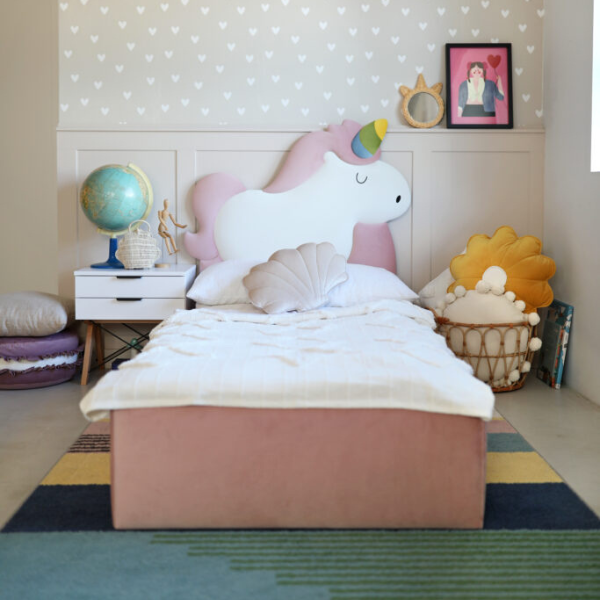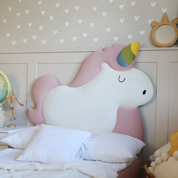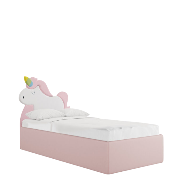 Tapicerowane łóżko dziecięce Unicorn z pojemnikiem i zagłówkiem w kształcie jednorożca – bajkowy akcent w pokoju Twojego dziecka!