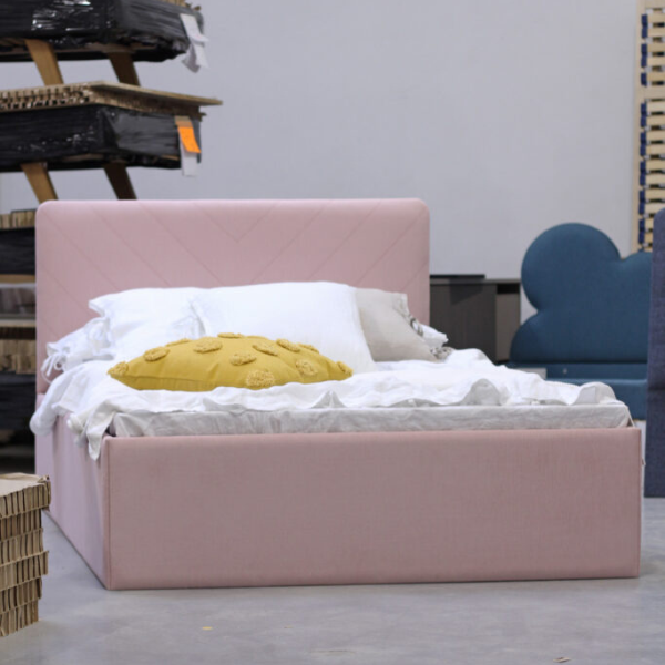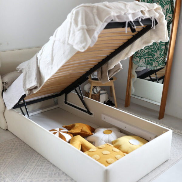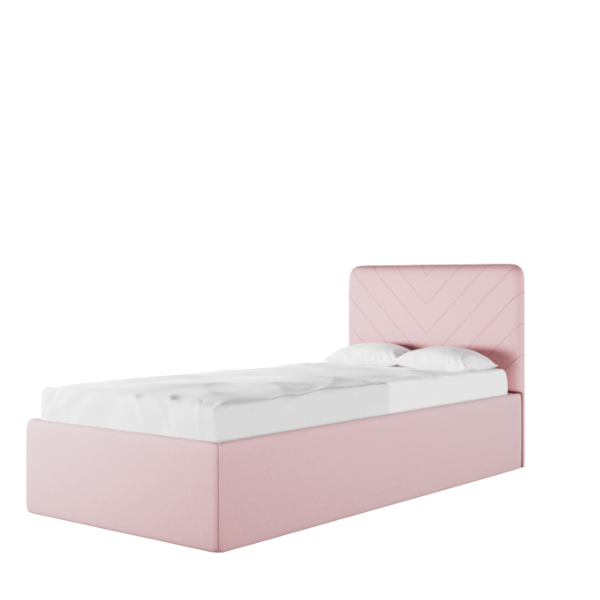 Model oferowany jest w wersji z pojemną, tapicerowaną skrzynią, która może służyć jako praktyczny schowek na pościel, koce czy zabawki. Całość obita jest tą samą tkaniną co zagłówek, co tworzy spójny i elegancki wygląd. W zestawie znajduje się także solidny stelaż z elastycznych listewek, które dopasowują się do materaca, zapewniając dziecku spokojny i zdrowy sen.
