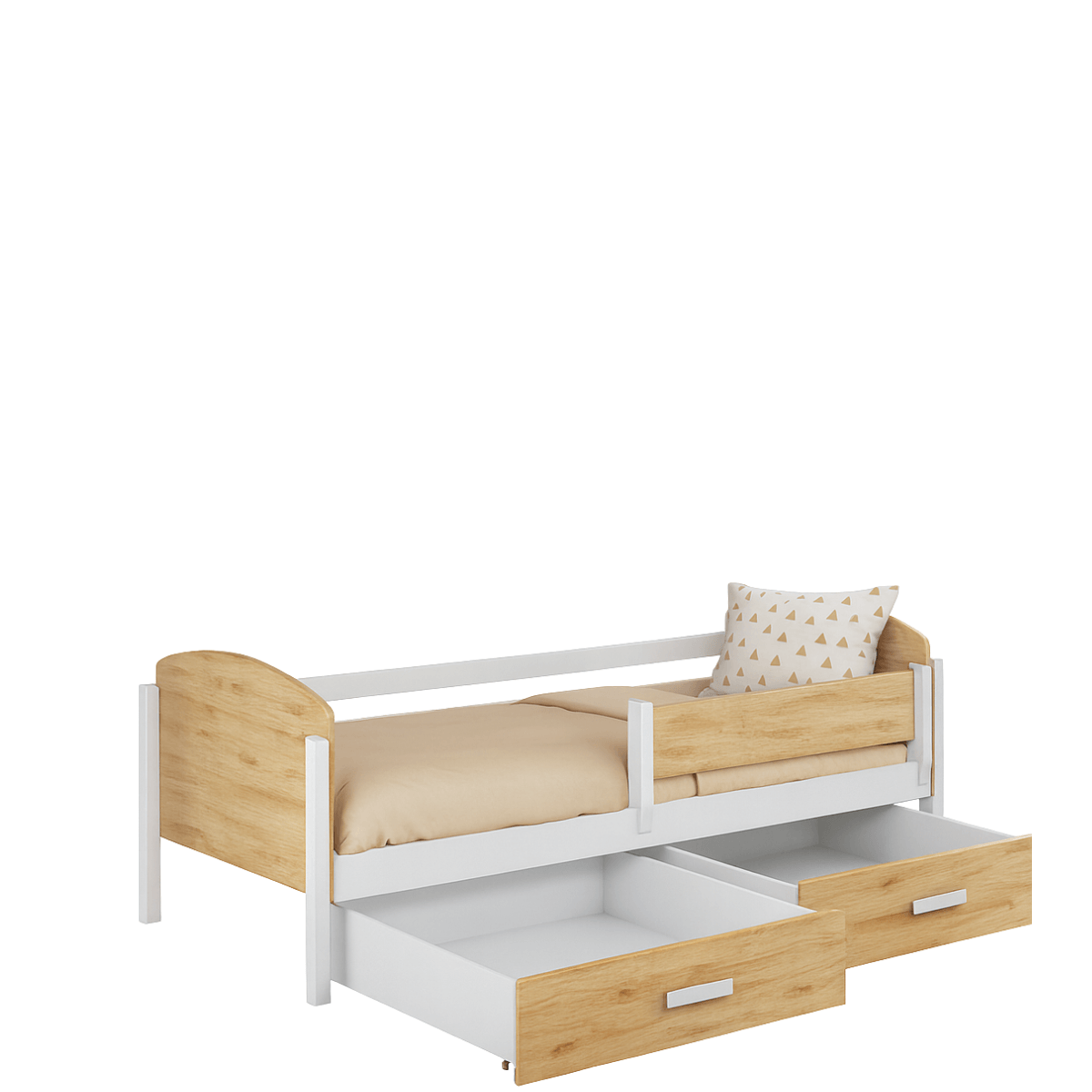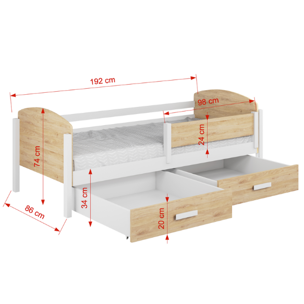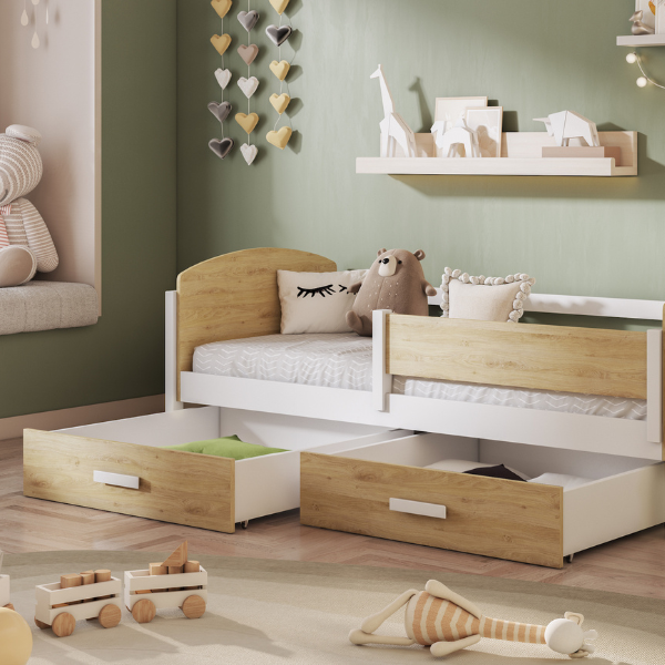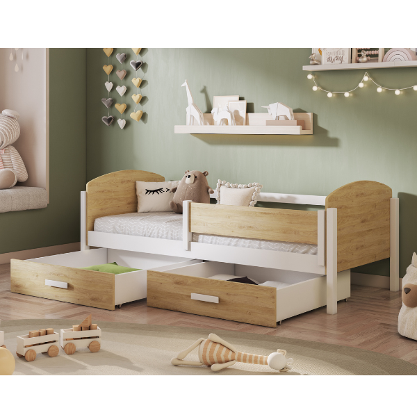 Model KELLY wyposażony jest w pojemne, wysuwane szuflady umieszczone pod łóżkiem. To idealne miejsce na pościel, ubrania, zabawki lub inne drobiazgi, które warto mieć pod ręką. Łóżko sprawdzi się zarówno w pokoju młodszego dziecka, jak i starszaka – łączy prosty design, naturalne materiały i praktyczne przechowywanie w jednym.