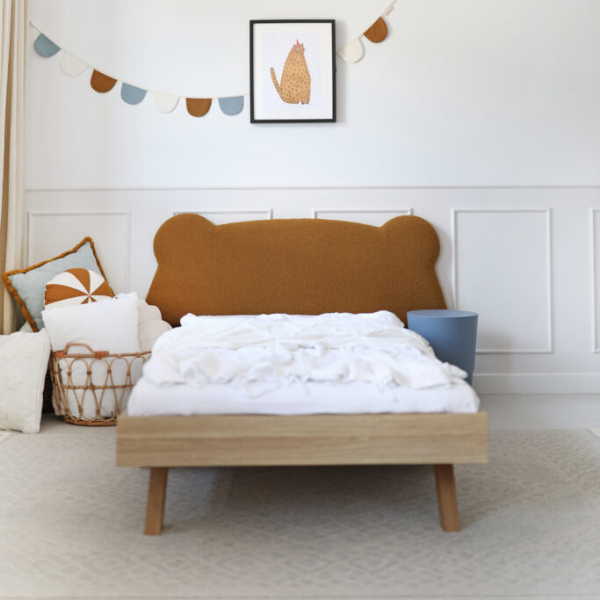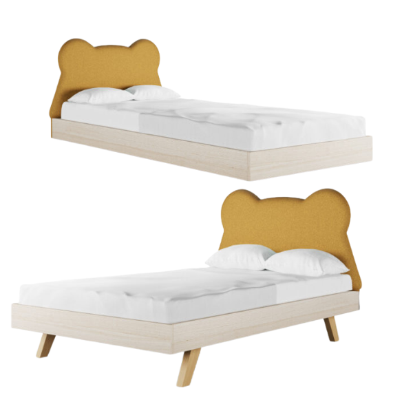 Łóżko dziecięce MISIO z serii Legs BASIC wyróżnia się prostą, ale solidną konstrukcją oraz tapicerowanym zagłówkiem w kształcie misia, który dodaje całości ciepła i przyjaznego klimatu.