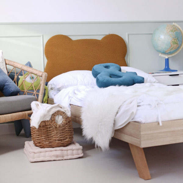 Gładka rama i nogi wykonane z naturalnego drewna – do wyboru bukowego lub dębowego – zapewniają trwałość oraz estetyczny wygląd. Tapicerowany zagłówek dostępny jest w szerokiej gamie miękkich tkanin z certyfikatem OEKO TEX, co gwarantuje bezpieczeństwo użytkowania i brak szkodliwych substancji. Mebel jest w pełni personalizowany – możesz dobrać odpowiedni kolor obicia, tworząc unikalny zestaw idealnie dopasowany do upodobań Twojego dziecka.