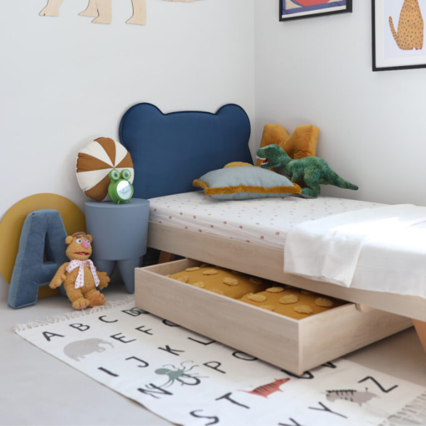 Łóżko świetnie sprawdzi się zarówno w pokoju kilkulatka, jak i nastolatka – jego uniwersalny design rośnie razem z dzieckiem. Dodatkowo łóżko można uzupełnić o pojemną szufladę wysuwaną na kółkach – idealną na pościel, zabawki czy inne drobiazgi. Jej front tapicerowany jest w tej samej tkaninie, co rama łóżka, co daje spójną i elegancką całość. Minko to synonim jakości, ręcznej pracy i odpowiedzialnej produkcji – lokalnie, ekologicznie i z sercem.