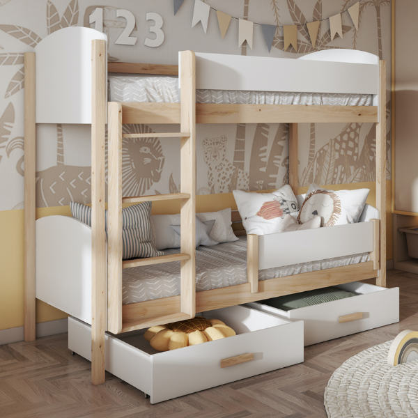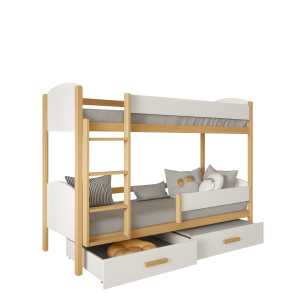 Dolne łóżko wyposażone jest w barierkę, która zapewnia bezpieczeństwo podczas snu, a wygodna drabinka umożliwia łatwe wejście na górną część łóżka. Oba poziomy zostały zaprojektowane tak, aby zapewnić komfort i wygodę na co dzień, a cała konstrukcja jest stabilna i przygotowana do intensywnego użytkowania przez dzieci.