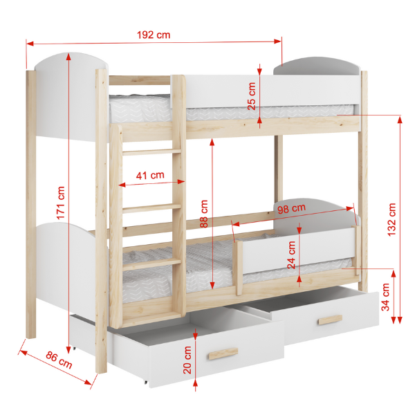 - Prześwit pomiędzy piętrami łóżka: 88 cm