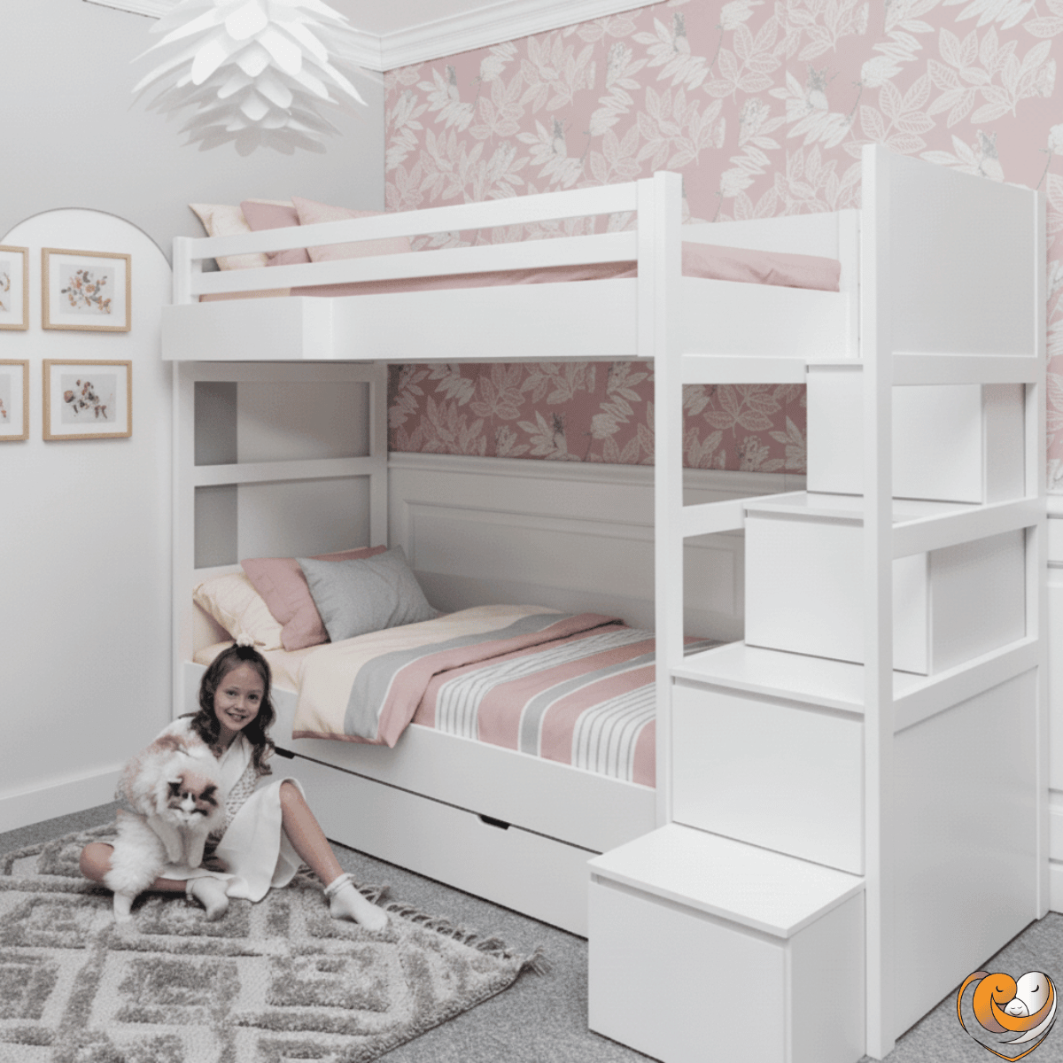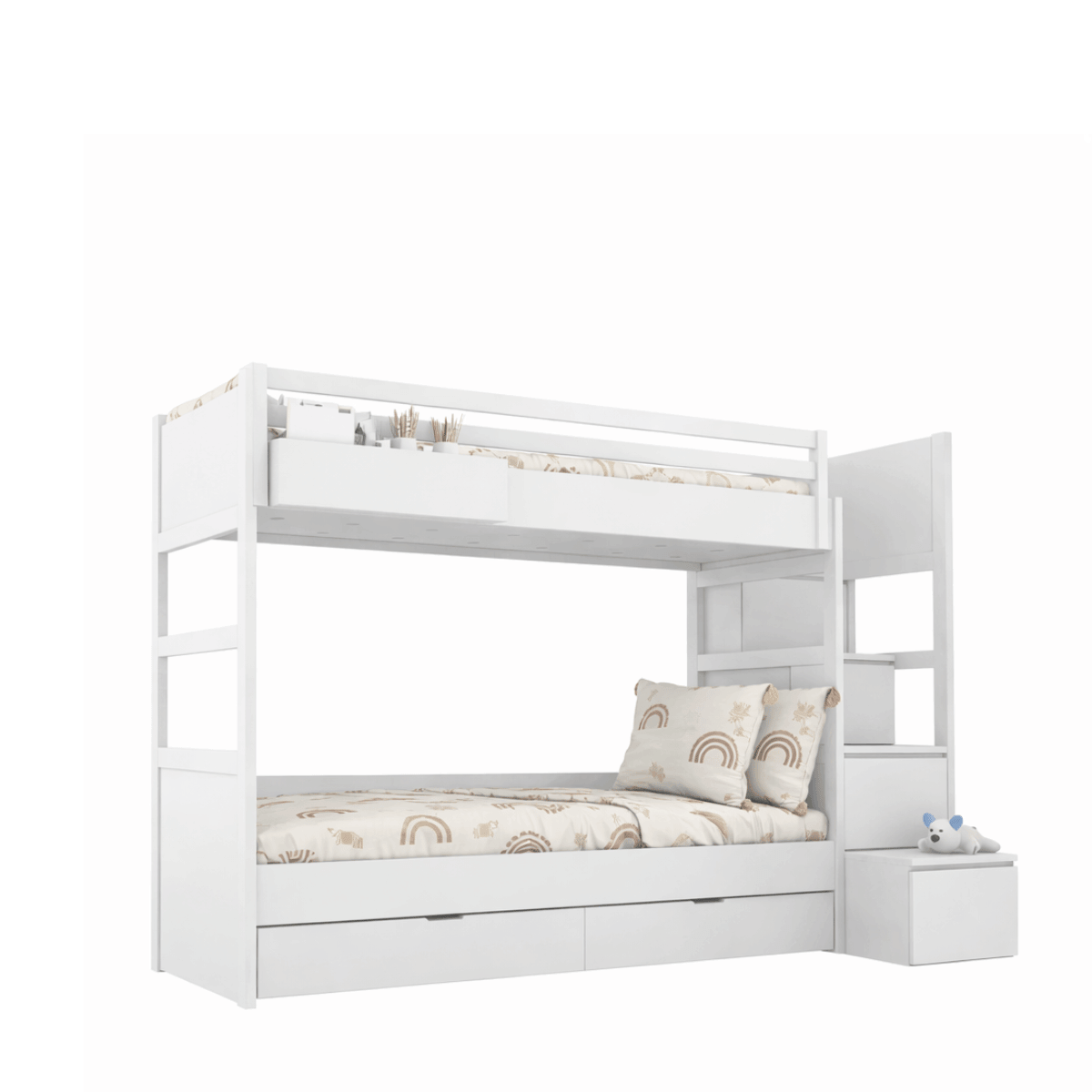 Stabilne schody z szufladami zapewniają wygodne wejście na górne łóżko oraz dodatkowe miejsce do przechowywania, dzięki czemu pokój dziecka pozostaje uporządkowany.