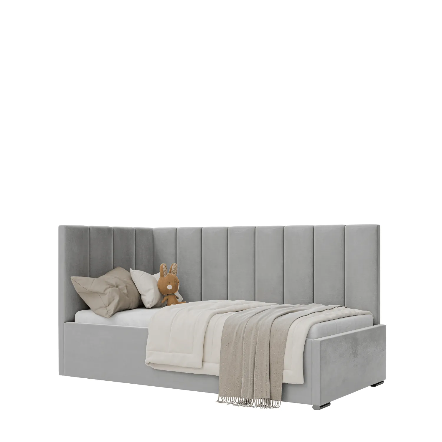 Łóżko tapicerowane dla dziecka KONEKT to model, który łączy przytulny wygląd, komfort snu i praktyczne rozwiązania ważne w codziennym użytkowaniu. Miękka tapicerka, dekoracyjne panele i dopracowana forma sprawiają, że łóżko pięknie prezentuje się w pokoju dziecka i tworzy wygodną przestrzeń do odpoczynku.