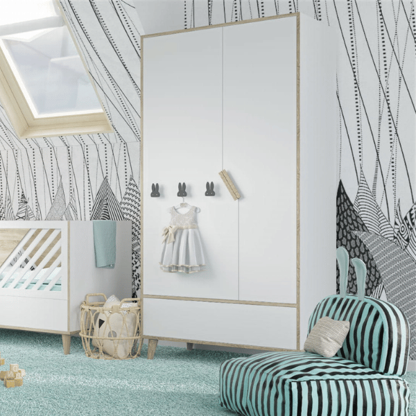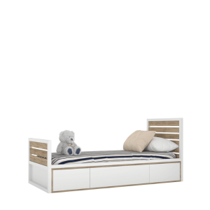 to wygodny i praktyczny mebel, który wyróżnia się nietypową formą. Asymetryczne fronty nadają łóżku wyjątkowy charakter, idealnie pasujący do potrzeb starszego dziecka czy nastolatka. Wykończenie brzegów przy szufladzie z drewna oraz połączenie drewna z bielą nadają meblowi charakterystyczny styl skandynawski, doskonale komponujący się z wnętrzem pokoju dziecka. Łóżko zostało wyposażone w szeroką szufladę, co stanowi praktyczne rozwiązanie do przechowywania różnych przedmiotów. Podwyższony zagłówek i przynóżek wykonane z drewnianych listewek dodają całej konstrukcji atrakcyjnego akcentu.