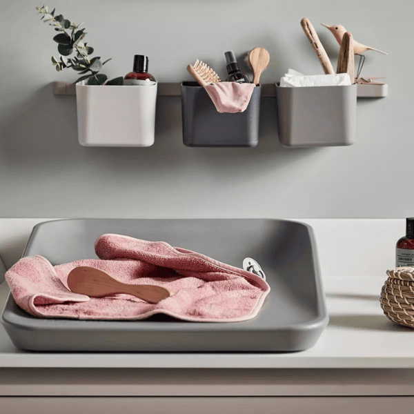 Utrzymaj porządek w pokoju dziecka dzięki temu systemowi przechowywania firmy Leander. Jego stylowe kolory będą pasować do dziecięcego pokoju. System składa się z trzech odpinanych organizerów, dwóch haczyków i dwóch szyn, które można przymocować do ściany. System przechowywania pomaga utrzymać to, co niezbędne w pokoju dzieci (np. pieluchy, body i smoczki), w przejrzystym porządku. Wszystko ma swoje miejsce i jest łatwo dostępne. Zawieś szyny na ścianie nad przewijakiem, aby mieć pod ręką najpotrzebniejsze dziecięce akcesoria w pokoju dziecinnym. Możesz też powiesić je na wewnętrznej stronie drzwi szafy, aby uzyskać dodatkowe miejsce do przechowywania. Organizery można także umieścić blisko łóżka dziecka i włożyć do nich książeczki i pluszowe misie.