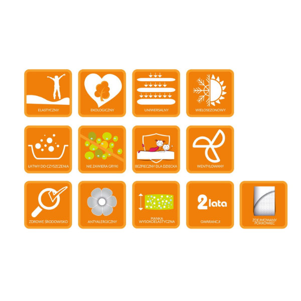 BUDOWA:Materac wykonany z 10 cm pianki HR o podwyższonej sztywności i elastyczności, optymalnie dopasowanej dla starszych dzieci i juniorów. Zastosowana specjalna pianka w kolorze niebieskim, na bazie olejków roślinnych, zapewnia komfort i bezpieczeństwo, zastępując tradycyjne składniki naftowe bardziej ekologicznymi. Struktura komórkowa pianki umożliwia swobodny przepływ powietrza, co zapewnia doskonałą oddychalność i higienę. Materiał jest antyalergiczny i dedykowany osobom z alergiami oraz problemami skórnymi.