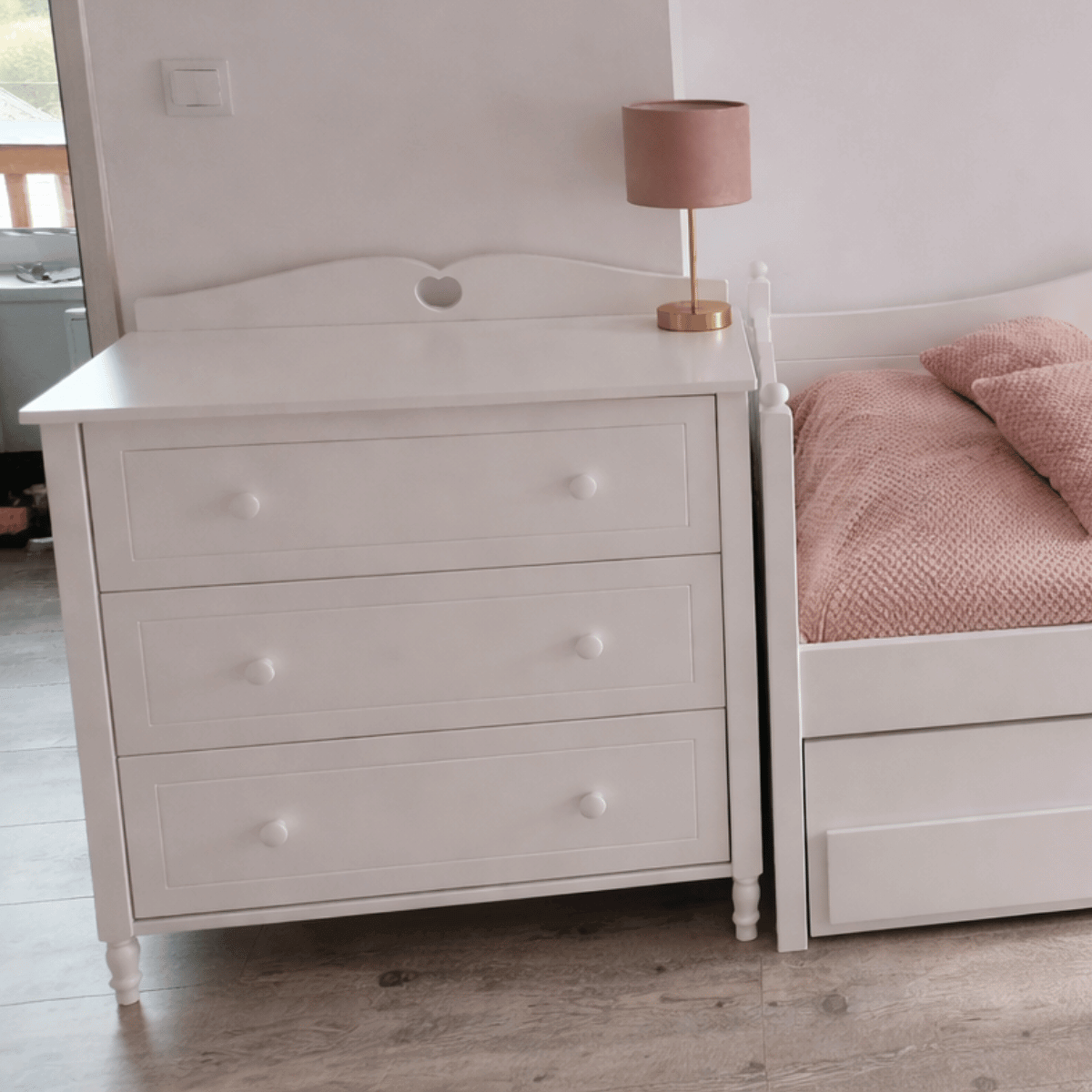 To biała komoda do pokoju dziewczynki, która łączy elegancki styl GLAMOUR z wygodnym przechowywaniem i trwałym wykonaniem.