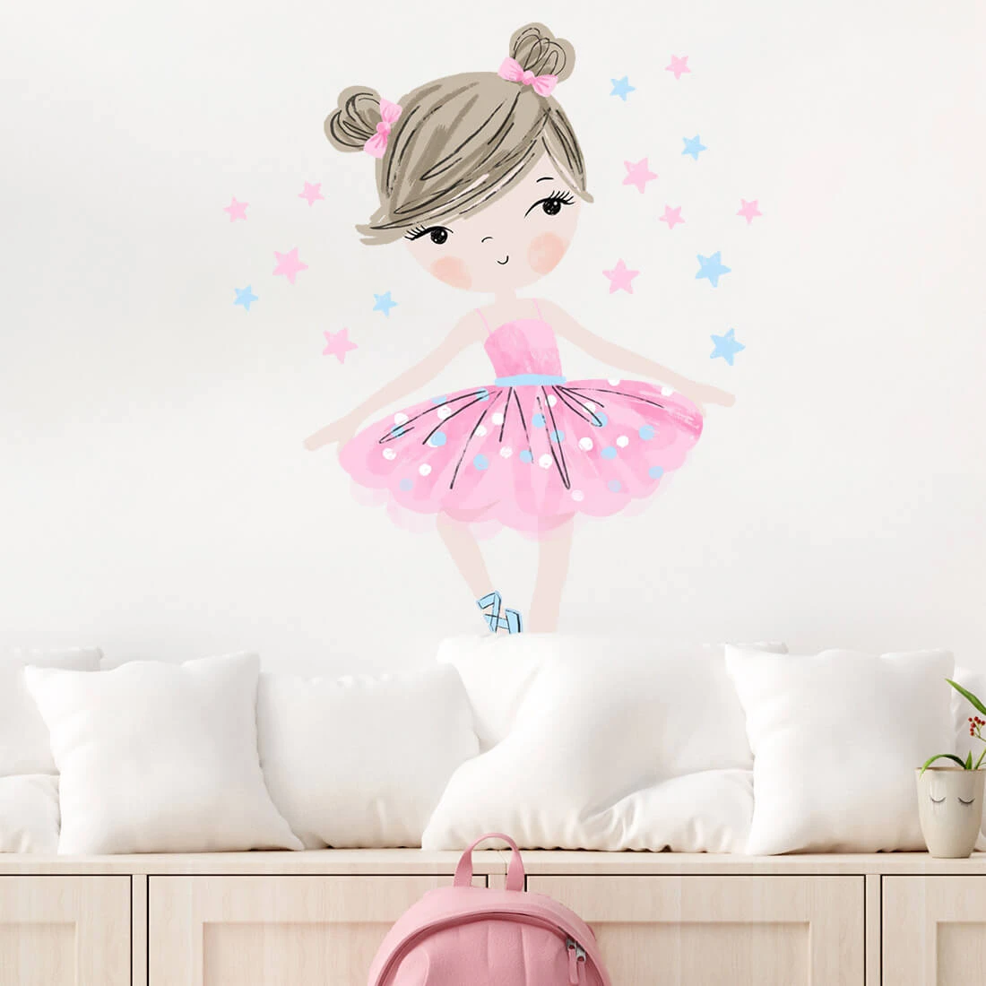to wyjątkowa dekoracja, która wnosi do pokoju dziecka lekkość, radość i bajkowy klimat. Ilustracja przedstawia dziewczynkę w tanecznej pozie, ubraną w delikatną sukienkę baletową z subtelnymi zdobieniami, która podkreśla jej wdzięk i elegancję. Jej włosy upięte są w dwa koki ozdobione kokardkami, a całość otaczają pastelowe gwiazdki w odcieniach różu i błękitu, tworzące magiczną aurę. Naklejka dostępna jest w dwóch wariantach kolorystycznych – z sukienką miętową lub różową, dzięki czemu łatwo dopasować ją do stylu wnętrza.