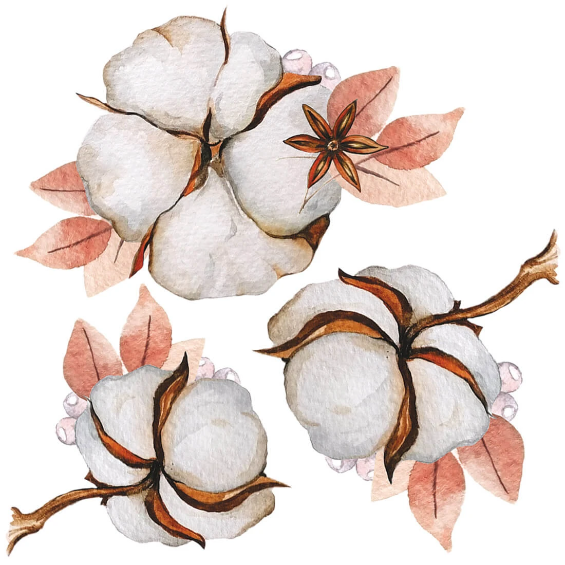 to subtelna i stylowa dekoracja, która wprowadza do wnętrza naturalność oraz ciepły, przytulny klimat. Delikatne, akwarelowe ilustracje przedstawiają gałązki bawełny z miękkimi, puszystymi pąkami w otoczeniu liści w ciepłych odcieniach beżu, brązu i pudrowego różu. Dzięki swojej uniwersalnej kolorystyce naklejki doskonale komponują się z wnętrzami w stylu boho, skandynawskim czy klasycznym. Mogą stanowić główną ozdobę ściany lub subtelne uzupełnienie większej aranżacji, nadając przestrzeni lekkości i harmonii.