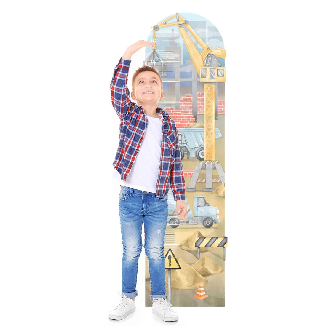 to funkcjonalna i jednocześnie dekoracyjna ozdoba do pokoju dziecka, która łączy zabawę z praktycznym zastosowaniem. Ilustracja przedstawia dynamiczną scenę z placu budowy – dźwig, ciężarówki, betoniarkę oraz elementy konstrukcyjne i znaki ostrzegawcze, które nadają całości realistyczny i ciekawy charakter. Akwarelowa stylistyka oraz stonowane, przyjemne kolory sprawiają, że miarka doskonale komponuje się z dziecięcymi wnętrzami, szczególnie w stylu nowoczesnym lub tematycznym. To świetna propozycja dla małych miłośników maszyn i pojazdów budowlanych.