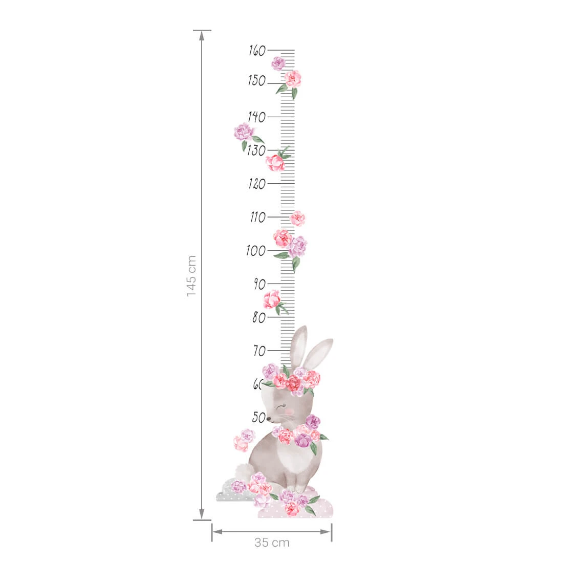 to wyjątkowa dekoracja do pokoju dziecka, która łączy funkcjonalność z pięknym, bajkowym designem. Delikatna, akwarelowa ilustracja przedstawia sympatycznego królika ozdobionego subtelnymi kwiatami piwonii, co nadaje całości lekkości i elegancji. Miarka nie tylko pomaga śledzić rozwój dziecka, ale również stanowi wyjątkowy element aranżacji wnętrza, idealnie pasujący do stylu klasycznego, skandynawskiego czy boho. Dzięki czytelnej skali możliwe jest wygodne zaznaczanie kolejnych etapów wzrostu. Na miarce odnotowywać można wzrost od 50 do 160 cm, co sprawia, że będzie ona towarzyszyć dziecku przez wiele lat.