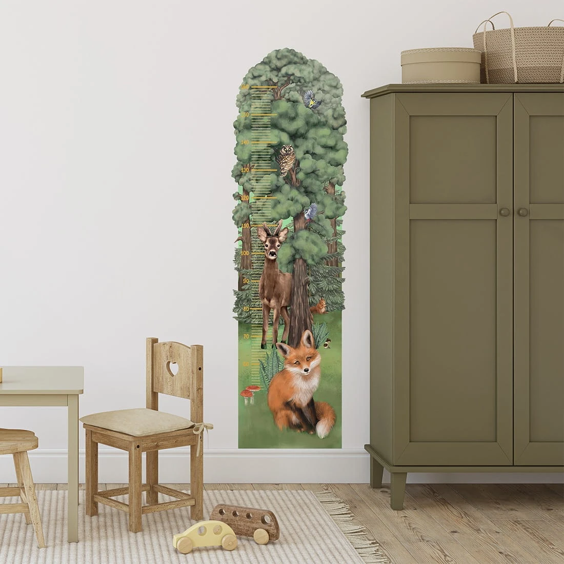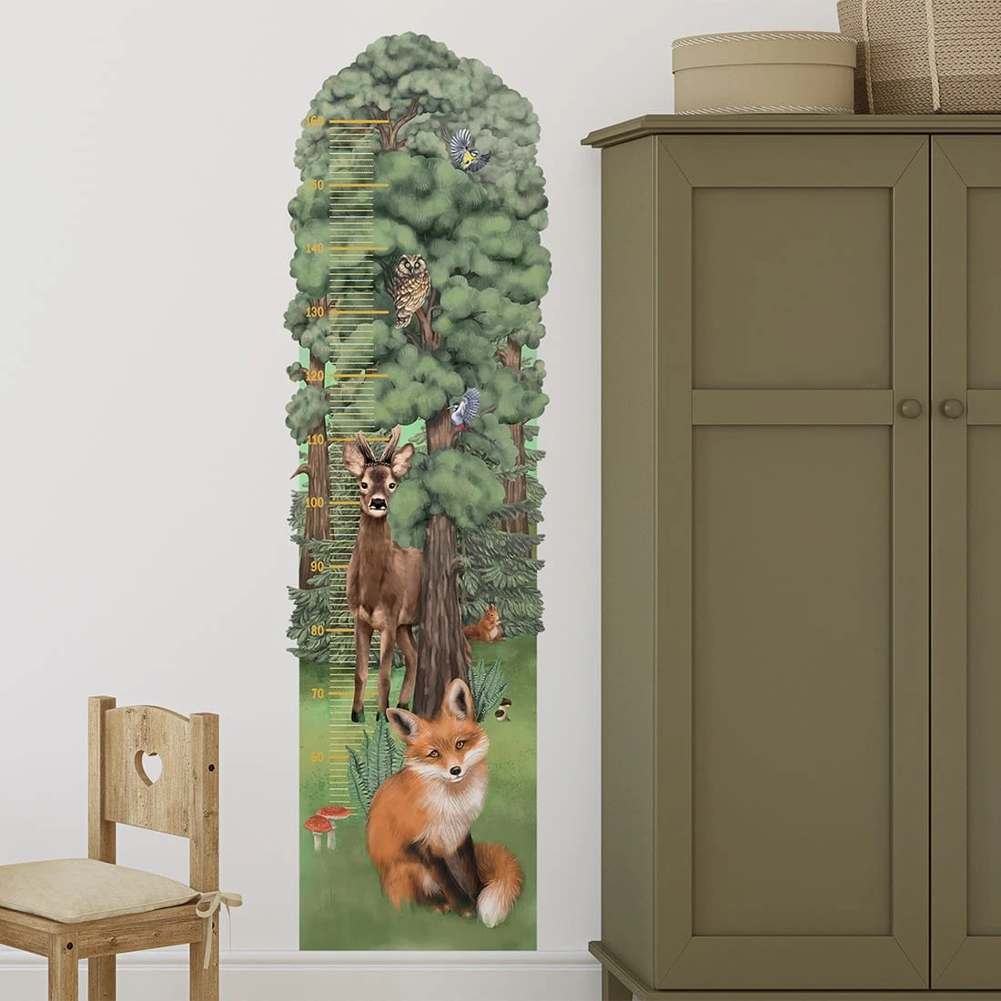 to wyjątkowa dekoracja do pokoju dziecka, która łączy funkcję praktyczną z piękną, naturalną ilustracją. Akwarelowa grafika przedstawia urokliwy las z jego mieszkańcami – lisem, sarenką, sową oraz ptakami, tworząc spokojną i harmonijną kompozycję inspirowaną naturą. Zielona, stonowana kolorystyka doskonale pasuje do wnętrz w stylu skandynawskim, boho oraz klasycznym, wprowadzając do pomieszczenia przytulny klimat. Miarka pozwala na regularne zaznaczanie wzrostu dziecka, stając się wyjątkową pamiątką na długie lata.