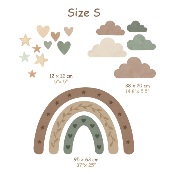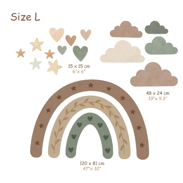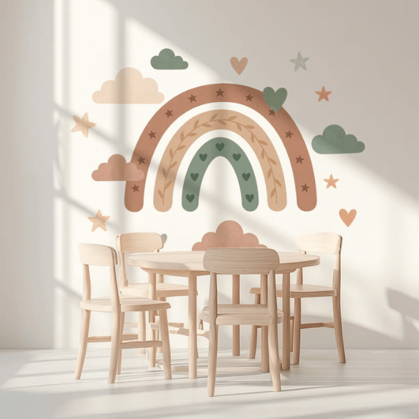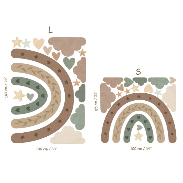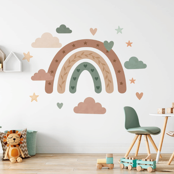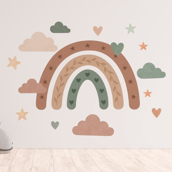 Zanurz dziecięcy pokój w kojących barwach natury. Ta urocza naklejka z pastelową tęczą, chmurkami, gwiazdkami i serduszkami tworzy przytulną atmosferę idealną do zabawy i odpoczynku. Stonowane kolory ziemi pięknie wpisują się w styl boho, vintage czy skandynawski.