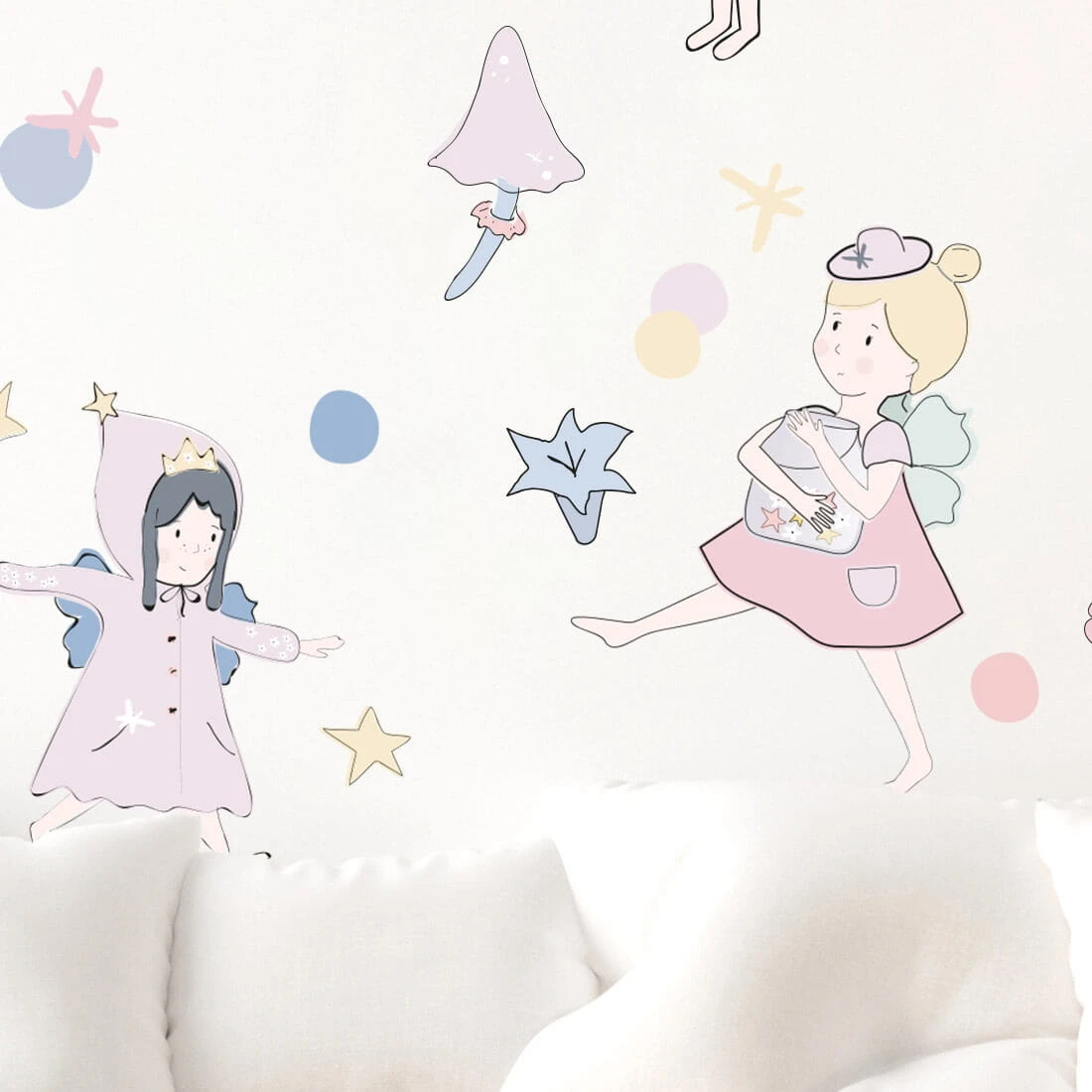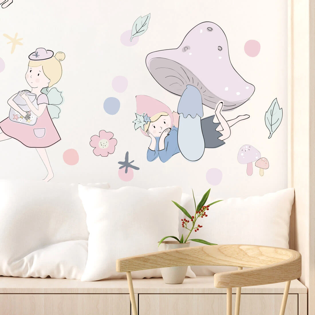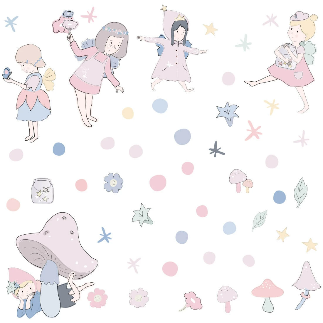 to wyjątkowa dekoracja, która wprowadza do pokoju dziecka magiczny, bajkowy klimat pełen delikatności i fantazji. Kompozycja składa się z kilku uroczych wróżek w różnych pozach, otoczonych gwiazdkami, kropeczkami, kwiatkami oraz leśnymi elementami, takimi jak grzybki i listki. Każda postać ma swój unikalny charakter, co pozwala tworzyć własne, niepowtarzalne aranżacje na ścianie. Pastelowa kolorystyka sprzyja wyciszeniu i harmonii, dzięki czemu dekoracja doskonale sprawdzi się zarówno w pokoju niemowlaka, jak i starszego dziecka.