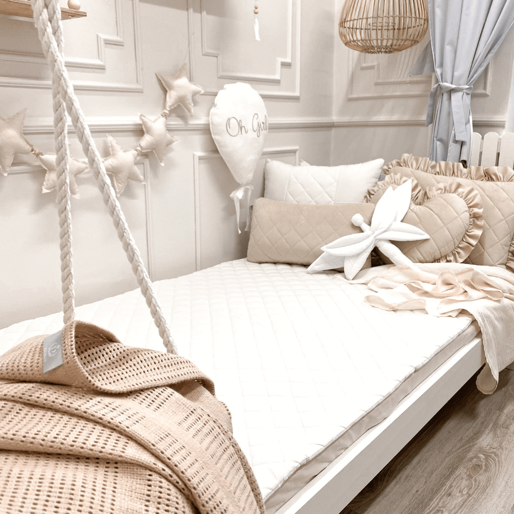 Narzuta wykonana jest w 100% z wysokiej jakości bawełny, dzięki czemu jest miękka, przewiewna i przyjazna dla wrażliwej skóry dziecka. Naturalna tkanina zapewnia komfort o każdej porze roku oraz odpowiednią cyrkulację powietrza.