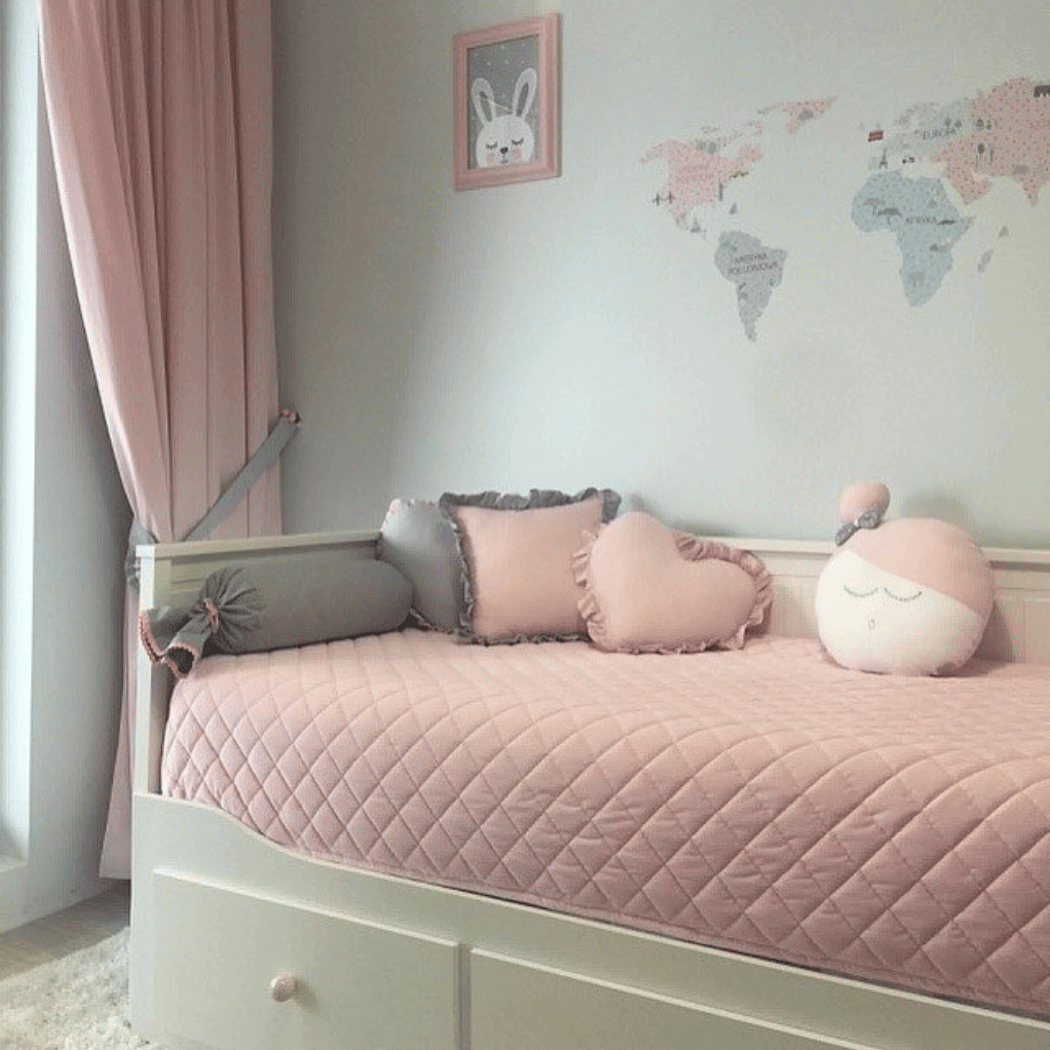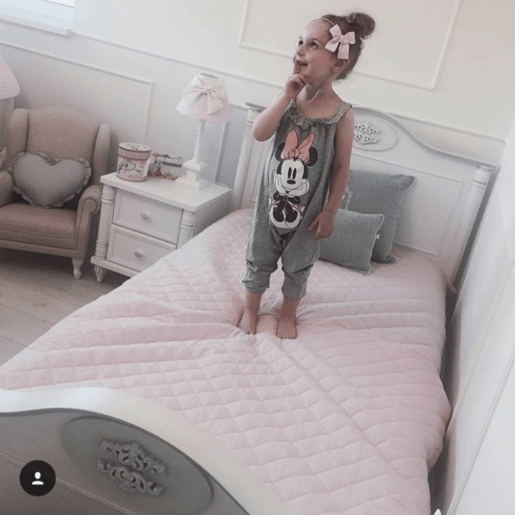 Spód narzuty wykonano z gładkiej bawełny w tym samym kolorze, co tworzy spójne, harmonijne wykończenie i pozwala łatwo dopasować ją do różnych stylów wnętrz – od klasycznych po nowoczesne pokoje dziecięce.