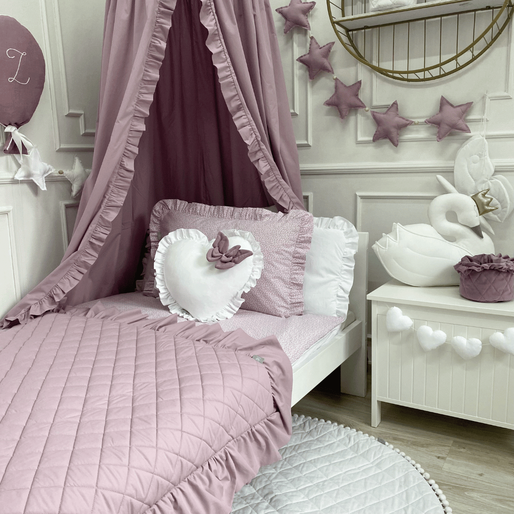 Pikowana narzuta z falbanką w kolorze lawendy to elegancki i praktyczny dodatek, który pięknie dopełnia aranżację łóżeczka lub łóżka dziecięcego. Została zaprojektowana z myślą o codziennym komforcie, bezpieczeństwie oraz estetyce dziecięcej przestrzeni – sprawdzi się zarówno w pokoju niemowlaka, jak i starszego dziecka czy nastolatki.