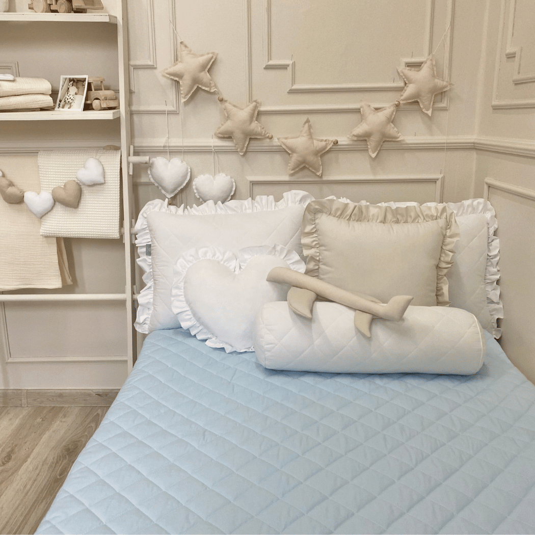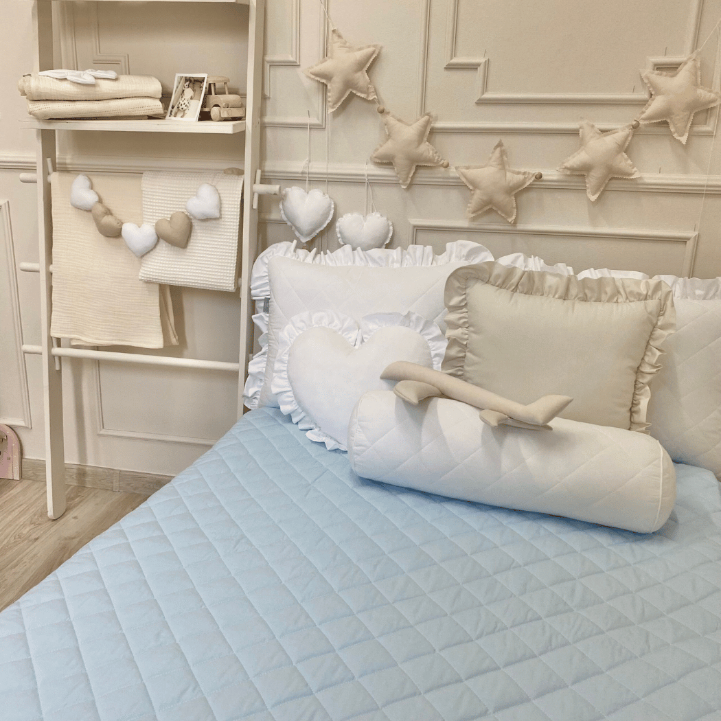 Spód narzuty wykonano z gładkiej bawełny w tym samym kolorze, co tworzy spójne, harmonijne wykończenie i pozwala łatwo dopasować ją do różnych stylów wnętrz – od klasycznych po nowoczesne pokoje dziecięce.