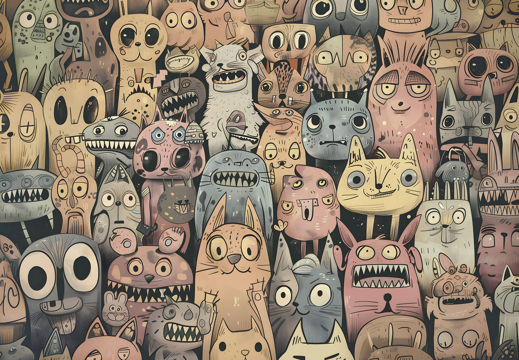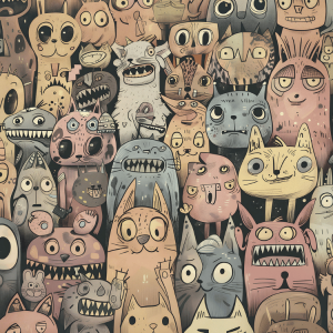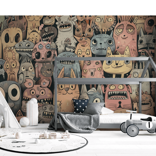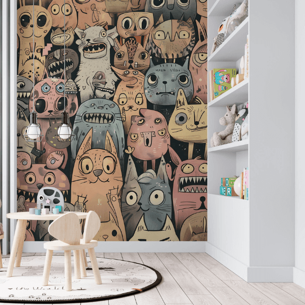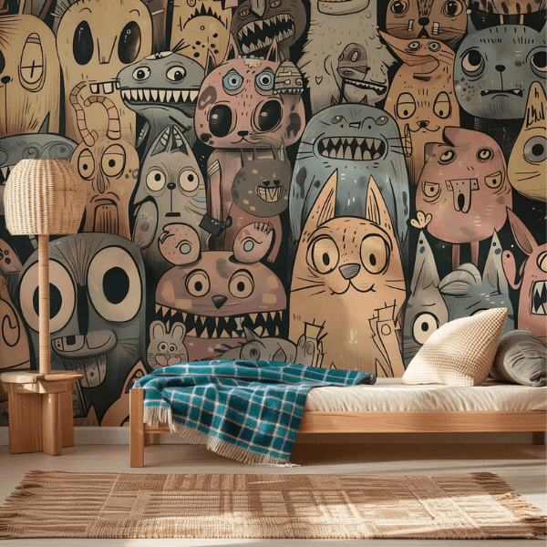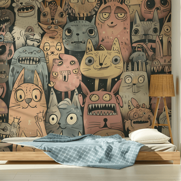to odważna, pełna charakteru dekoracja ścienna, która przenosi wnętrze w świat nieograniczonej wyobraźni i artystycznej fantazji. Kompozycję tworzy gęsty tłum zabawnych, lekko groteskowych postaci – fantastycznych stworzeń, zwierząt i dziwnych bohaterów o dużych oczach, nietypowych kształtach i wyrazistych minach. Każda postać jest inna, co sprawia, że tapeta przyciąga uwagę i zachęca do odkrywania kolejnych detali.