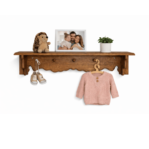Naturalne drewno sosnowe sprawia, że półka jest nie tylko estetyczna, ale również trwała i odporna na codzienne użytkowanie. Starannie wykończona powierzchnia podkreśla piękno słojów drewna, dzięki czemu każda półka prezentuje się wyjątkowo i szlachetnie. Dekoracyjny frezowany front nadaje jej subtelny, rustykalny charakter, który przyciąga wzrok i podkreśla styl wnętrza. Półka z wieszakami może pełnić funkcję praktycznego organizera w domu – idealnie sprawdzi się do przechowywania drobiazgów, zawieszania akcesoriów kuchennych lub eksponowania ulubionych dekoracji. To funkcjonalny mebel, który łączy praktyczność z eleganckim, naturalnym designem.