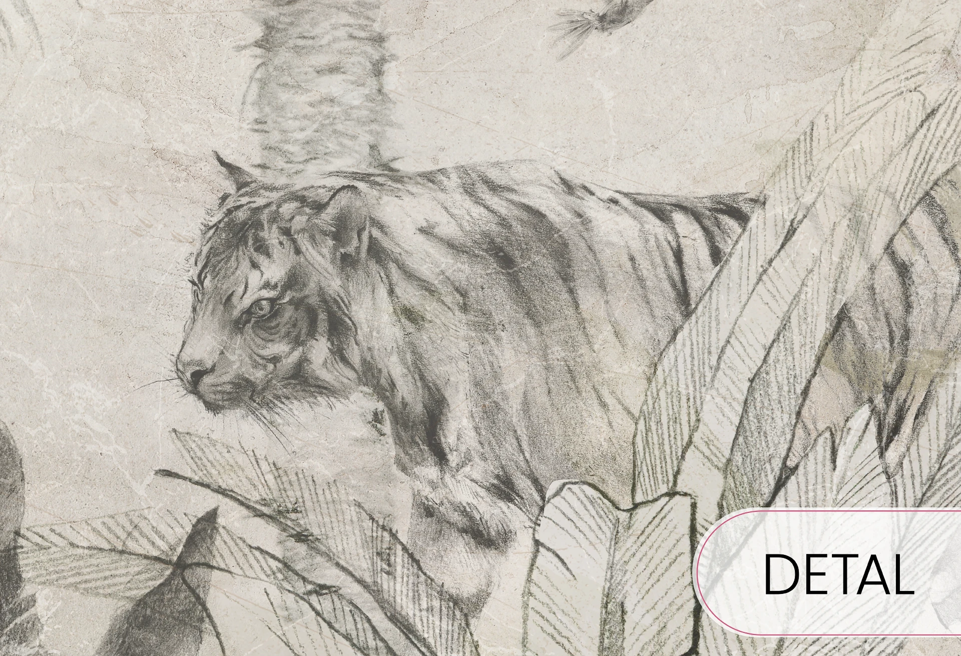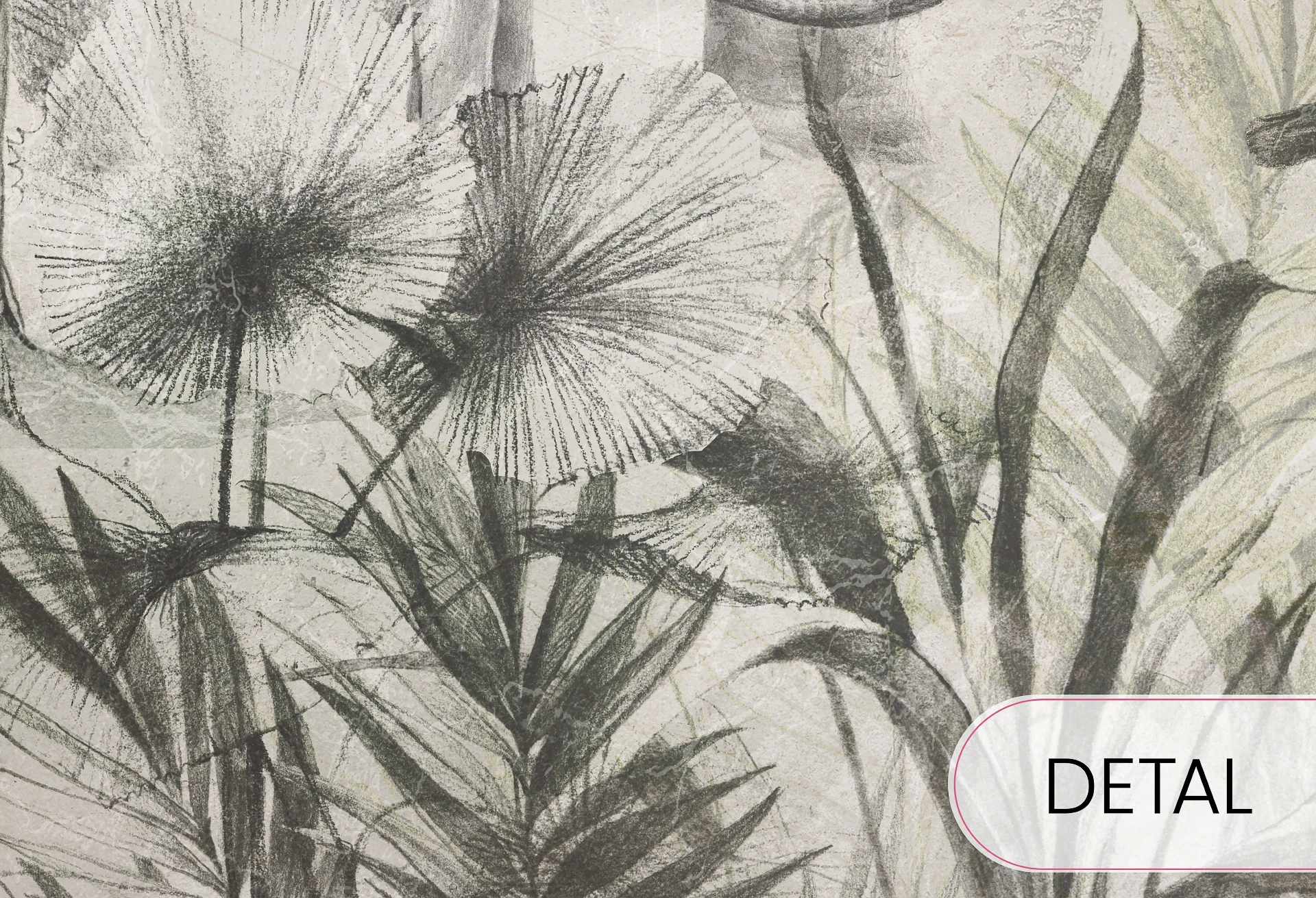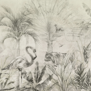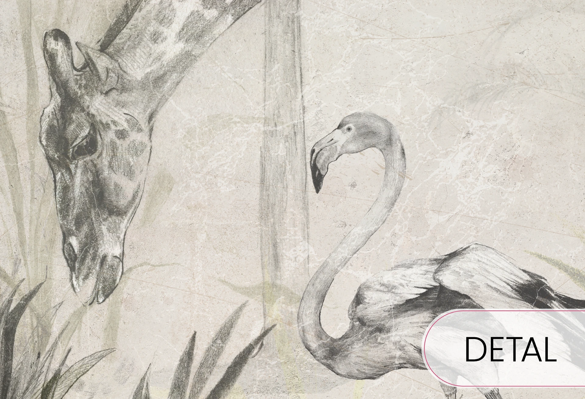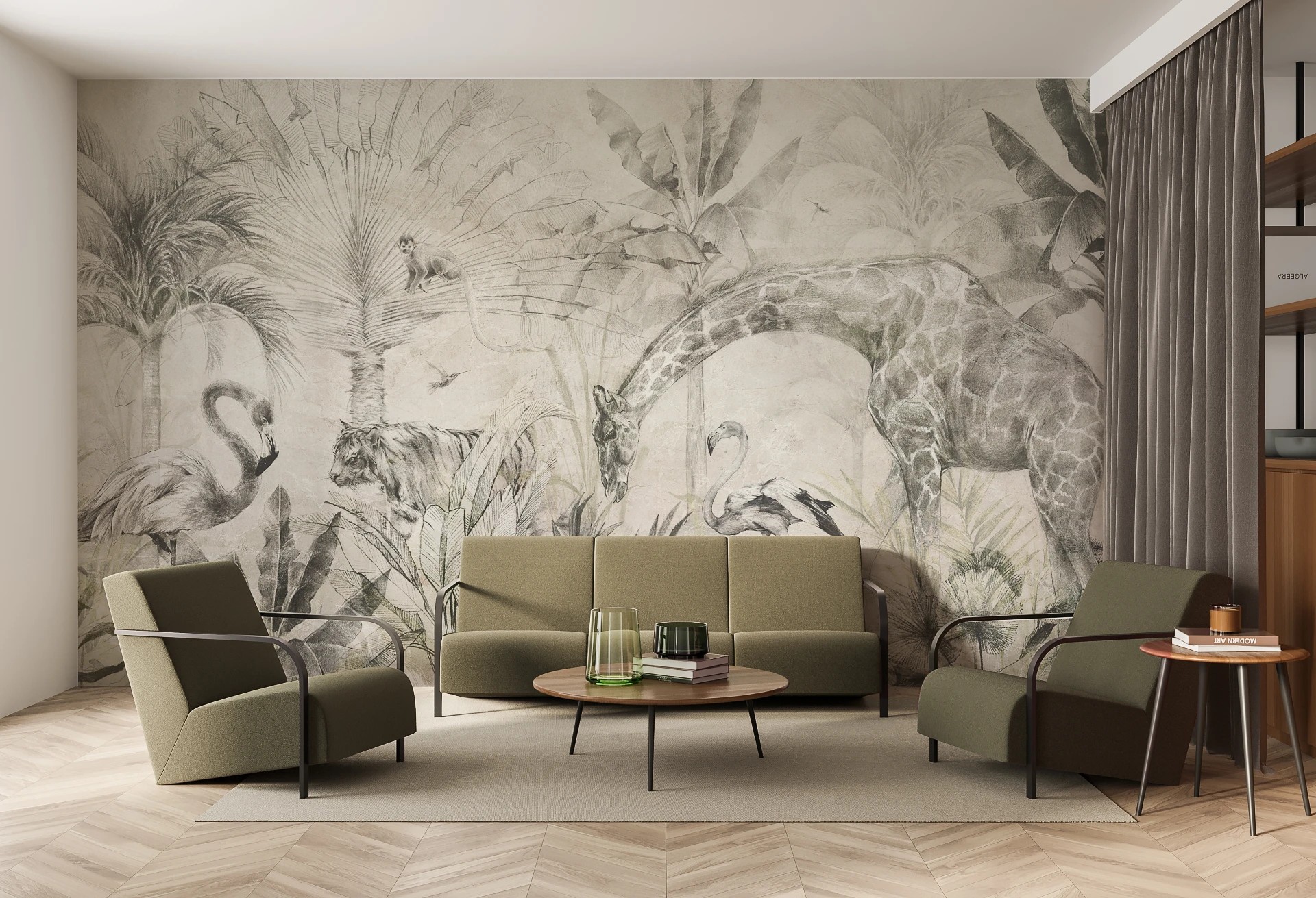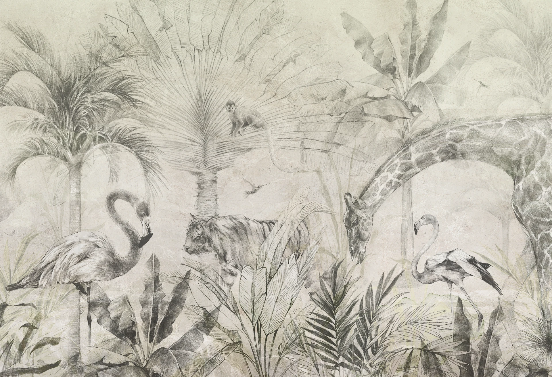 to wyjątkowa propozycja dla miłośników natury, subtelnej elegancji i ponadczasowego designu. Motyw egzotycznej dżungli przedstawiony w stonowanej, zielono-beżowej kolorystyce zachwyca ręcznie rysowanym charakterem i delikatnością detalu. Na tapecie pojawiają się majestatyczne zwierzęta – żyrafa, słoń, tygrys oraz flamingi – ukryte wśród bujnych liści palm i tropikalnych roślin, co tworzy spokojną, harmonijną kompozycję inspirowaną naturą.