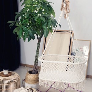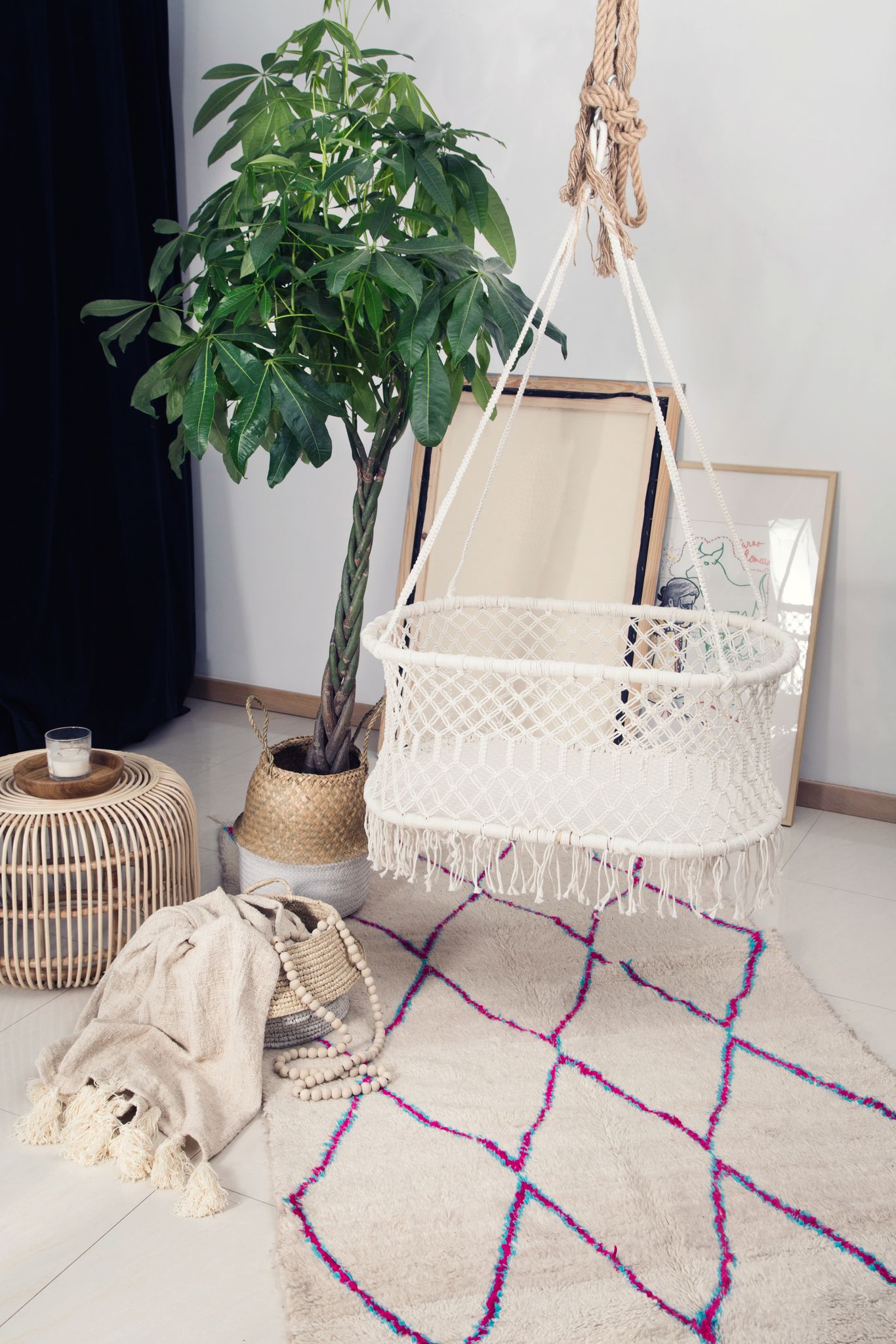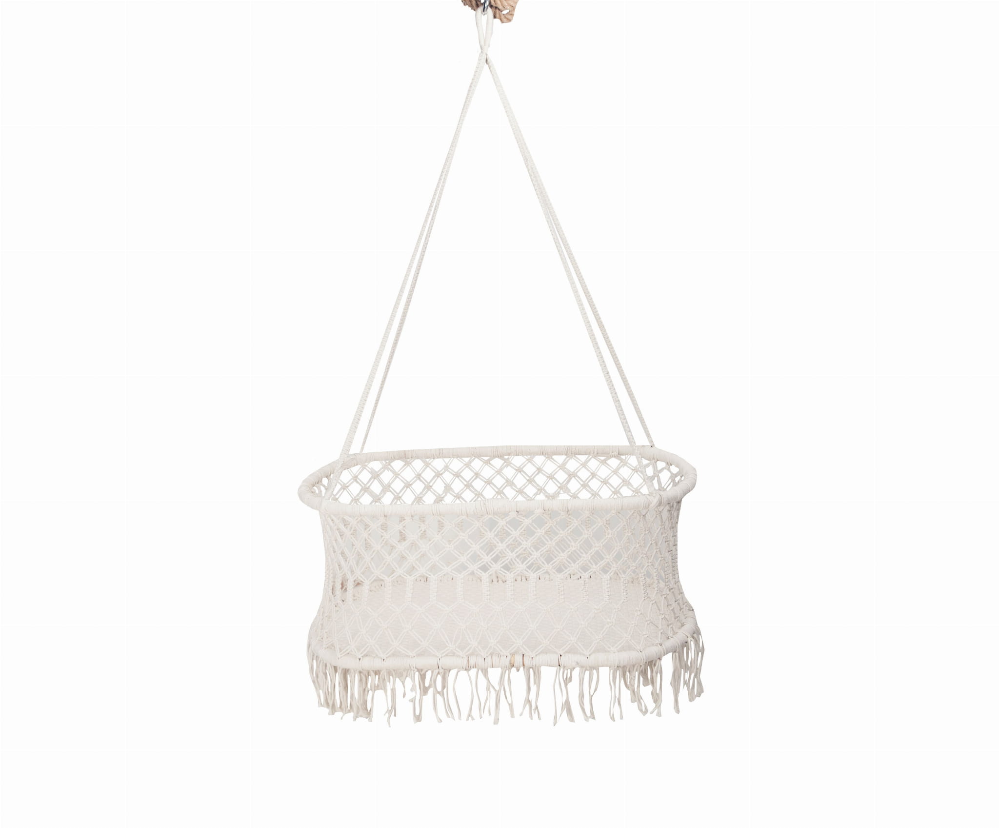 stanowi niezastąpiony element wyprawki dla nowo narodzonego dziecka. Jest to wyjątkowy i wyjątkowo delikatny sposób na kołysanie niemowlęcia od pierwszych dni życia. Cała kołyska została starannie wypleciona ręcznie ze sznurka za pomocą techniki makrama, co sprawia, że jest to nie tylko funkcjonalny, ale również piękny element wyposażenia dziecięcego. Dzięki mocnym linom, na których kołyska jest zawieszona, zapewnia ona bezpieczne i stabilne kołysanie dla maluszka. Otwory po bokach kołyski pozwalają dziecku na eksplorację otoczenia i poznawanie nowego świata, co wspomaga rozwój sensoryczny oraz stymuluje jego ciekawość. Dla noworodka kołyska ta może być nie tylko miejscem odpoczynku, ale także oazą spokoju, która sprzyja jego harmonijnemu rozwojowi.
