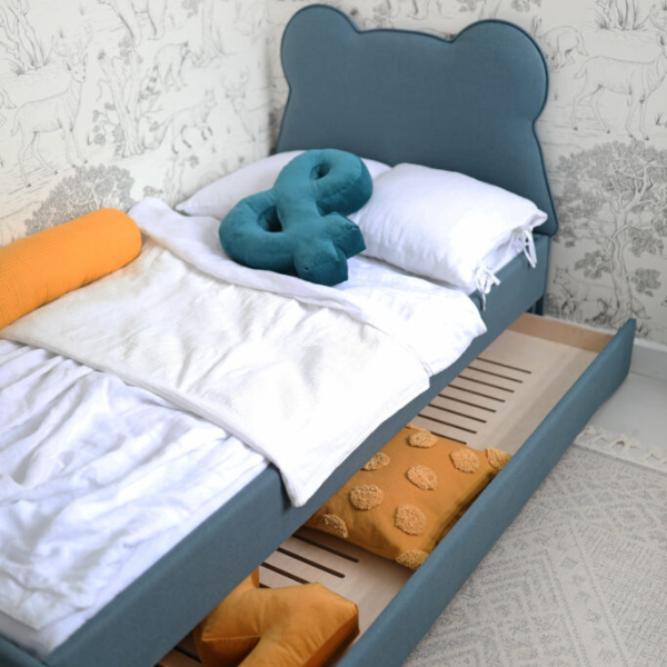 Serce konstrukcji stanowi elegancki zagłówek, który nadaje łóżku niepowtarzalnego charakteru, a jednocześnie zapewnia wygodne oparcie podczas czytania czy relaksu. Praktycznym rozwiązaniem jest również wysuwana szuflada – może ona pełnić funkcję dodatkowego miejsca do spania lub pojemnego schowka na pościel, zabawki czy sezonowe ubrania.